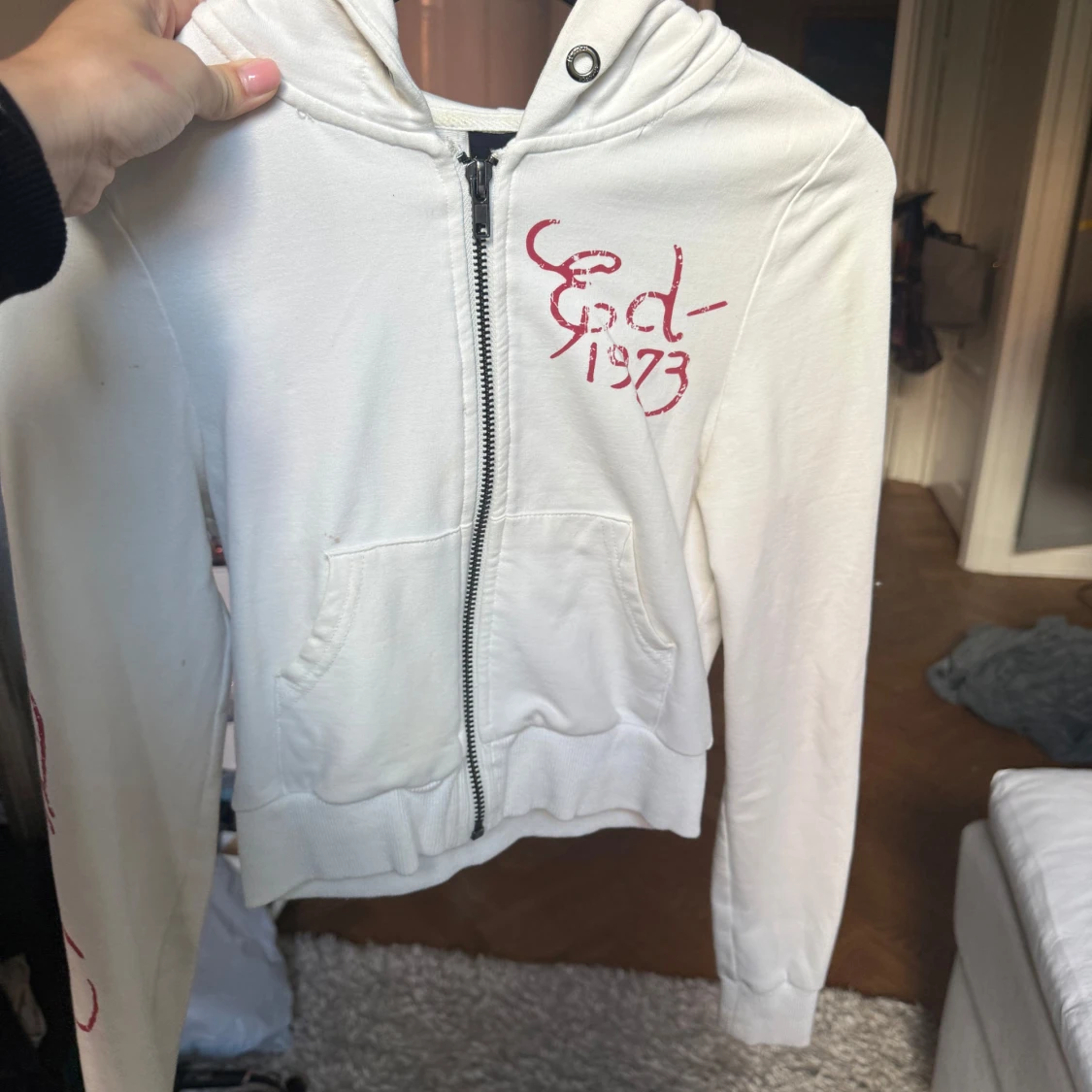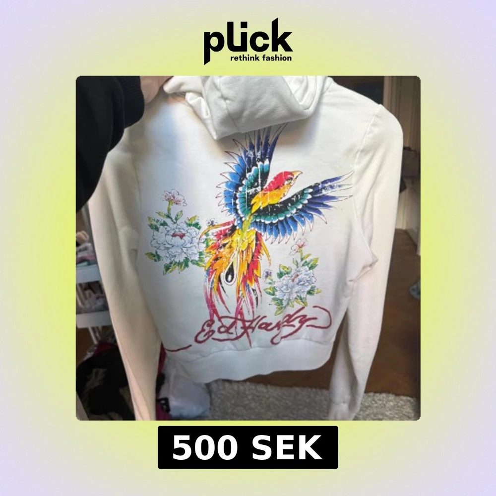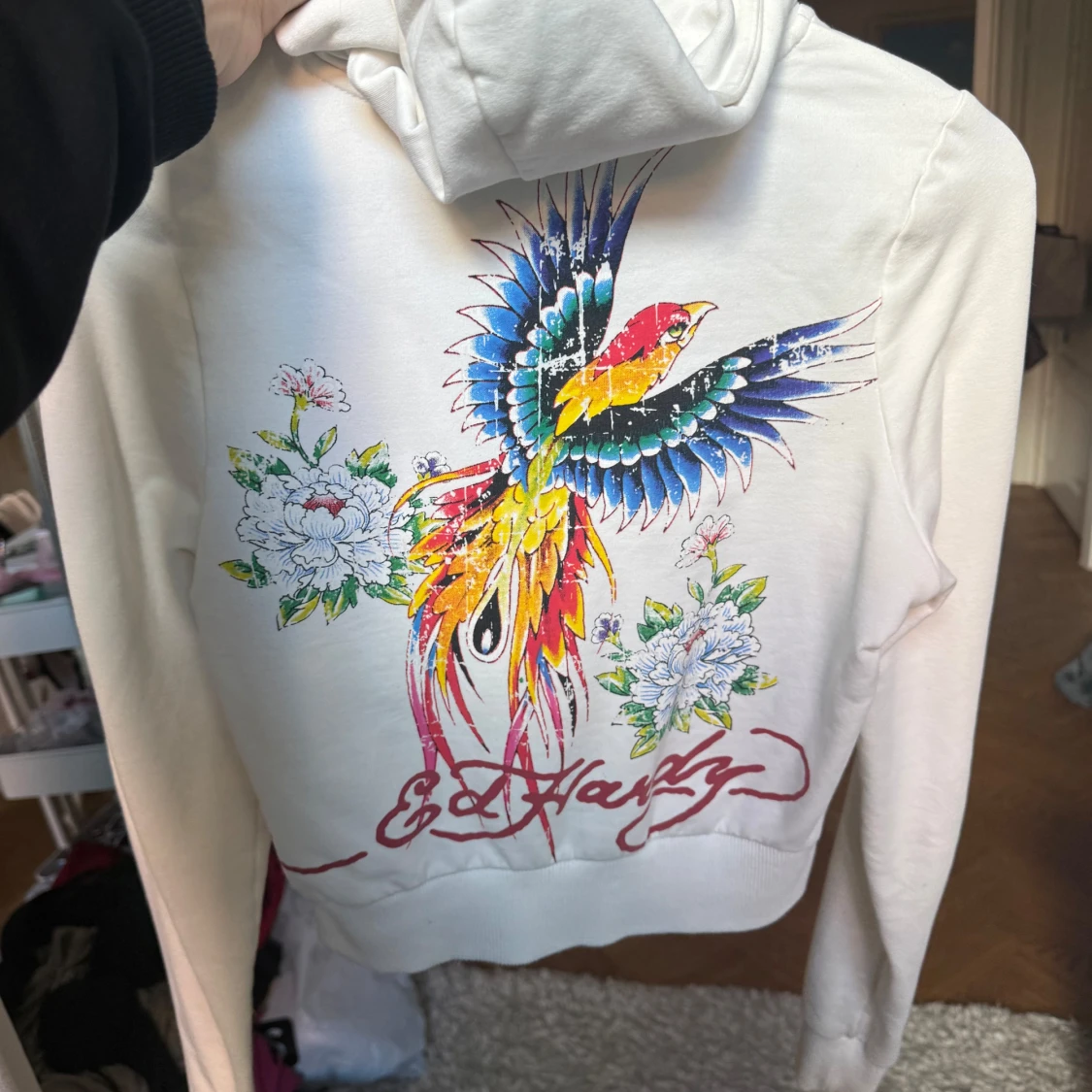 Säljer en vit hoodie från Ed Hardy med dragkedja och huva. Baksidan har en stor, färgglad fågel och blommor i blått, gult och rött, samt Ed Hardy-logga. Framsidan har tryck med årtal och fickor. Perfekt statement-plagg för dig som gillar unika prints.