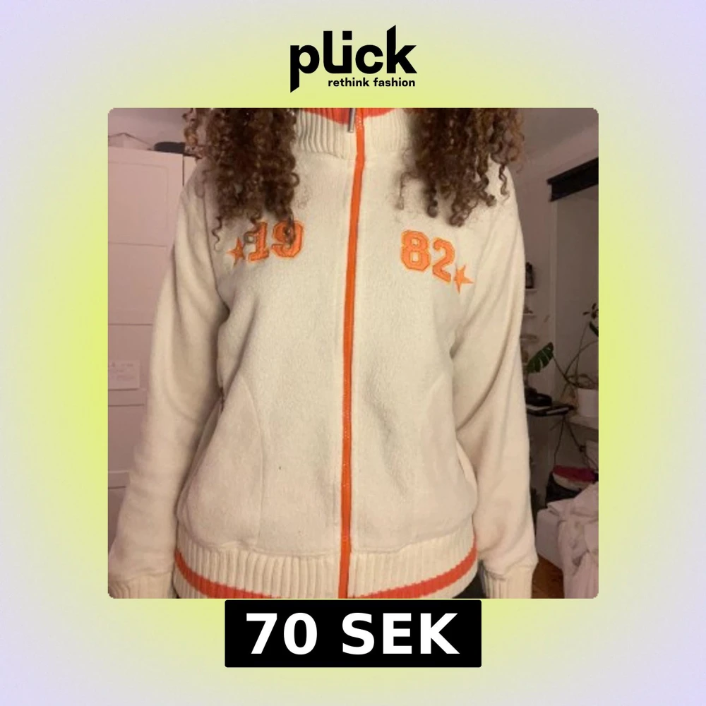Säljer en vit fleecejacka med orange dragkedja och detaljer. Jackan har årtalet '1982' broderat i orange på bröstet och ribbade muddar i orange och vitt. Perfekt för kyliga dagar!