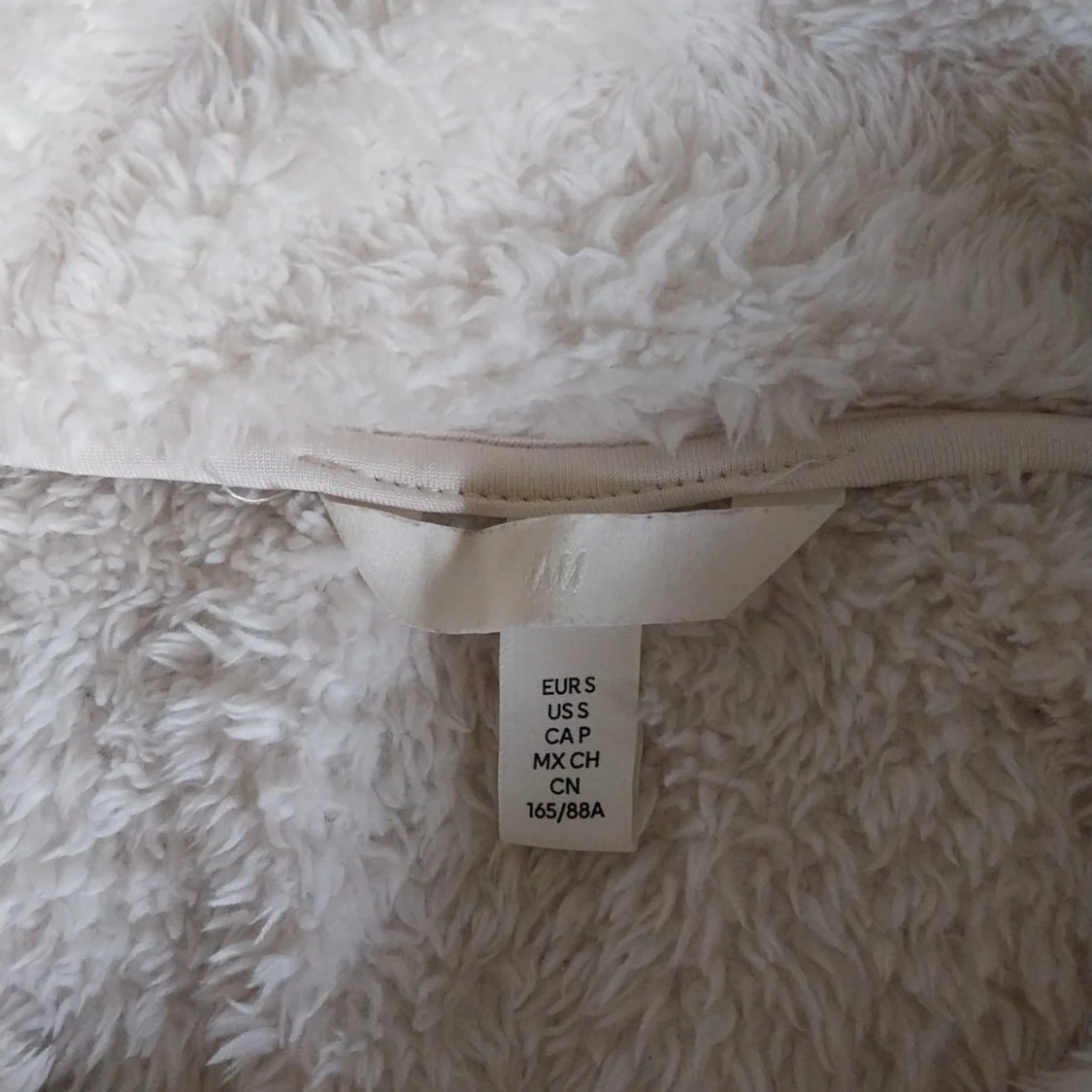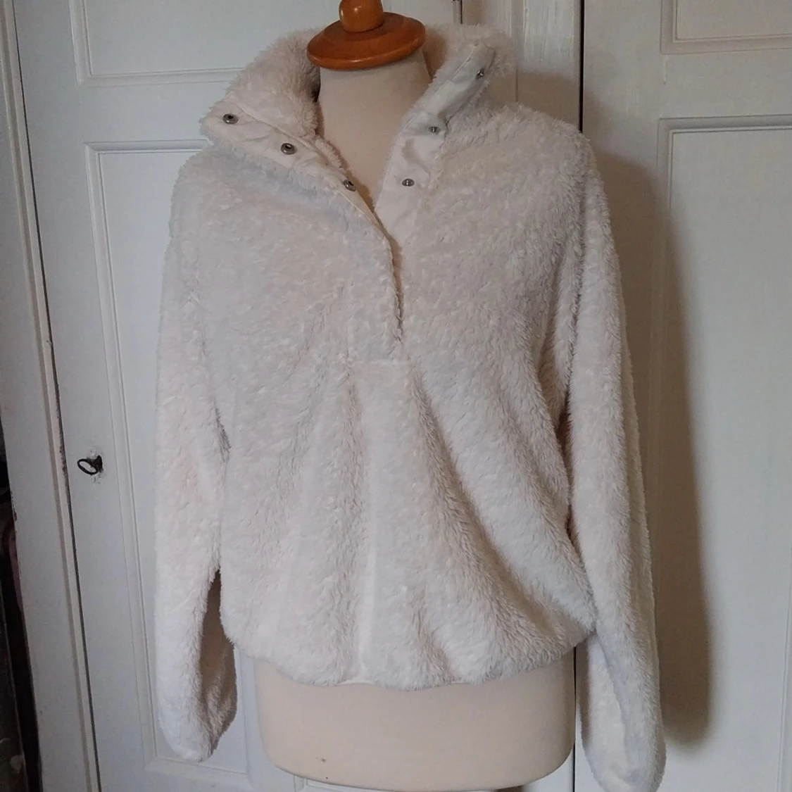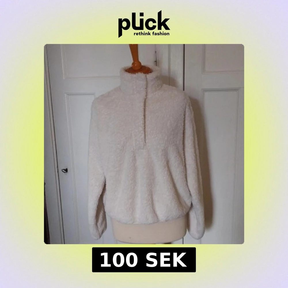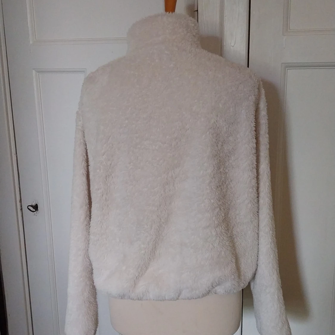 Supermjuk och fluffig vit fleece-tröja från H&M med hög krage och halv dragkedja med tryckknappar. Perfekt för kyliga dagar, har lång ärm och loose passform. Enkel att matcha och riktigt cozy vibe.