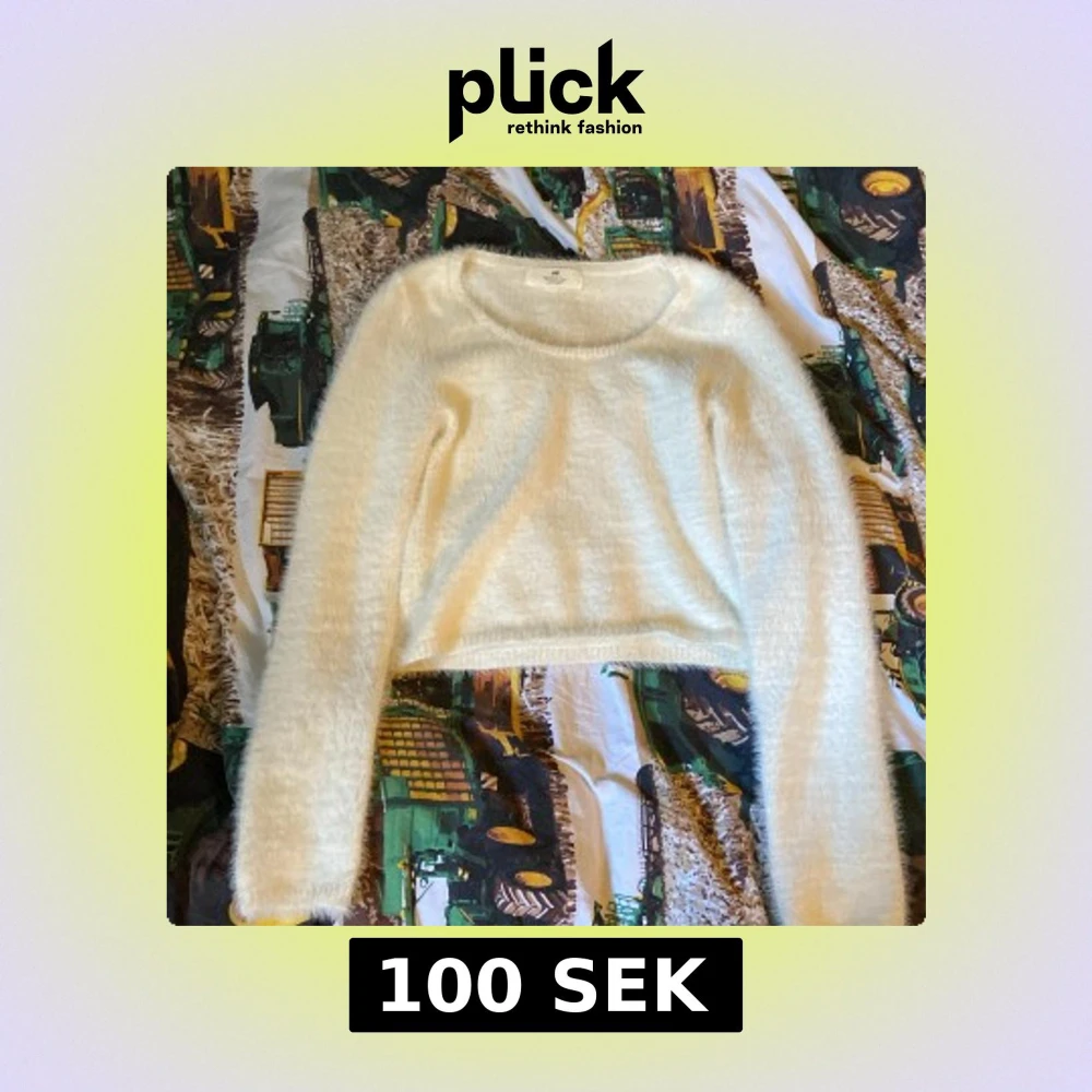 Supermjuk och fluffig vit stickad tröja från H&M med rund halsringning och lång ärm. Sitter figurnära och har en lätt croppad passform. Perfekt för lager på lager och ger en mysig vibe till din outfit.