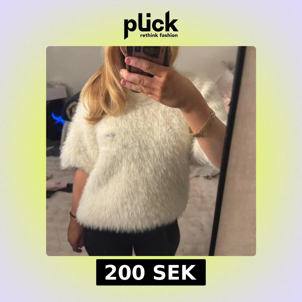 Säljer en supermjuk och fluffig vit tröja med korta ärmar. den här fått ett hål då säljer den vidare som kan ge den mer kärlek!! nypris 500 men billigare pga hålet
