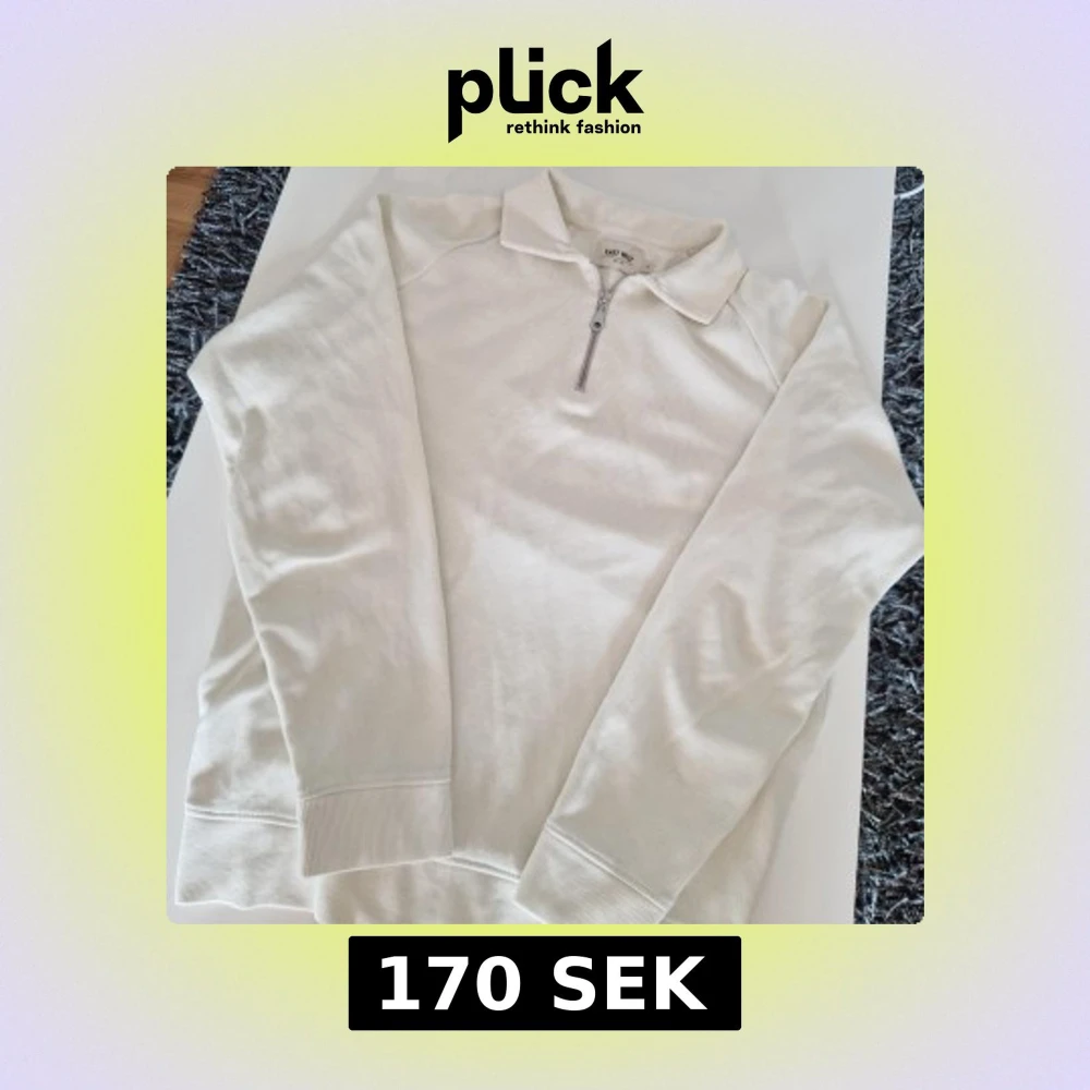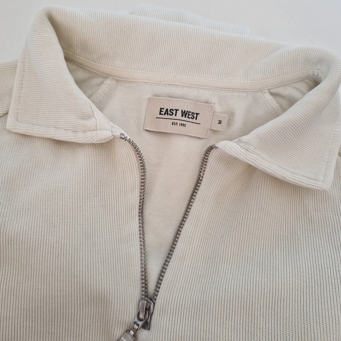 Säljer en stilren vit tröja från East West i storlek M. Tröjan har en klassisk krage och half zip-dragkedja framtill. Ribbade muddar vid ärmslut och nederkant. Perfekt för lager-på-lager och enkel att matcha.