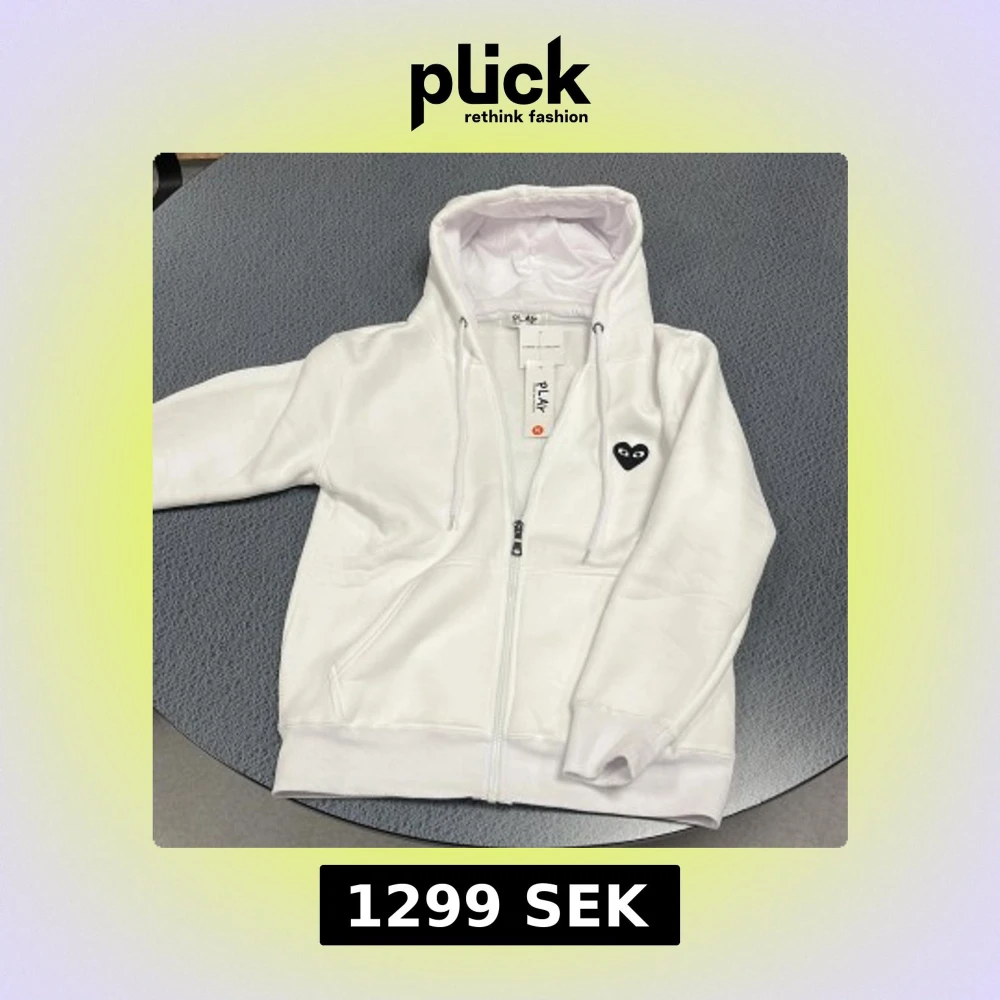 Säljer en clean vit hoodie från Comme des Garçons Play i storlek S. Tröjan har dragkedja, huva med snörning och det ikoniska svarta hjärta-ögon-loggan både fram och bak. Perfekt för dig som gillar stilrena streetwear-plagg.