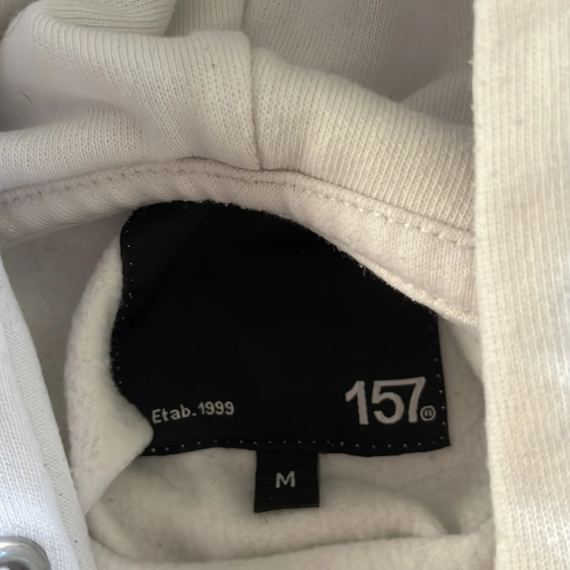 Säljer en clean vit hoodie från 157 i storlek M. Tröjan har huva med snörning och långa ärmar, samt bred mudd vid midjan. Perfekt för chill dagar eller när du vill ha en enkel och snygg look. Materialet är mjukt och känns skönt mot huden.