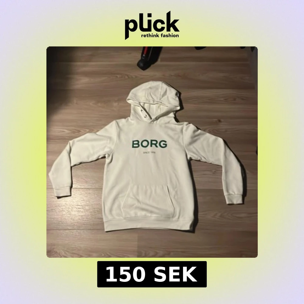 Vit hoodie från Björn Borg med grön BORG-logga på bröstet. Klassisk huva med snörningsdetaljer och stor magficka framtill. Mjuk och skön, perfekt för chill dagar. Långärmad och i bomullsmix för extra komfort.