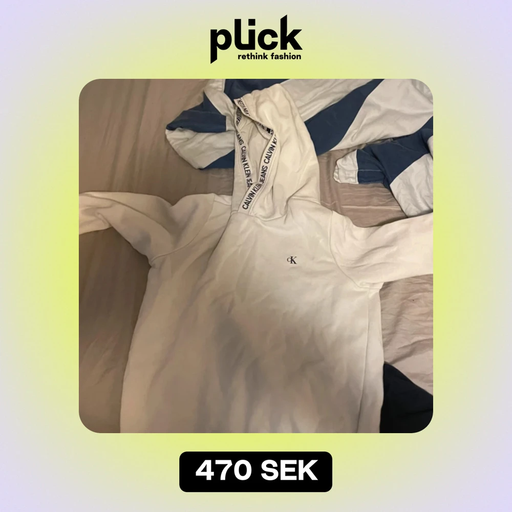 Säljer en snygg vit hoodie från Calvin Klein. Den har en liten CK-logga på bröstet och text på huvan. Supermjuk och bekväm!
