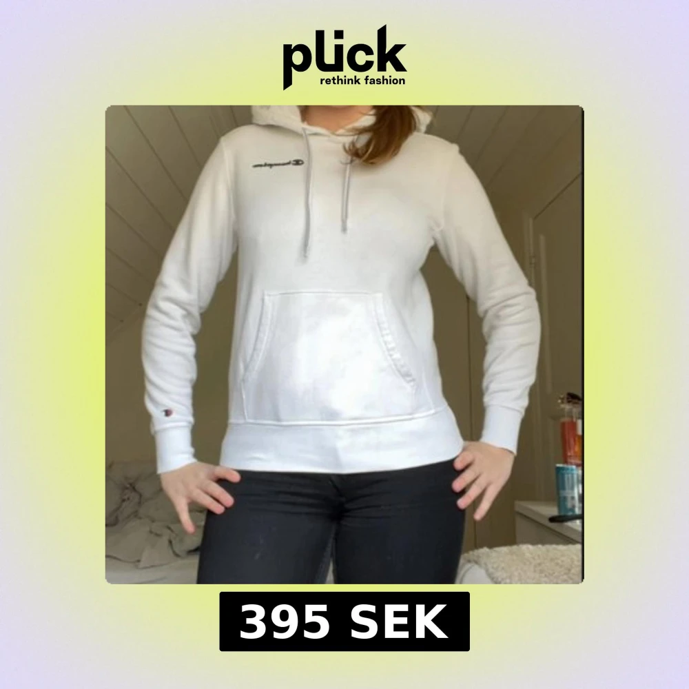 Säljer en stilren vit hoodie från Champion med justerbar huva och känguruficka. Den har långa ärmar och ett diskret Champion-märke på bröstet. Perfekt för en avslappnad look.
