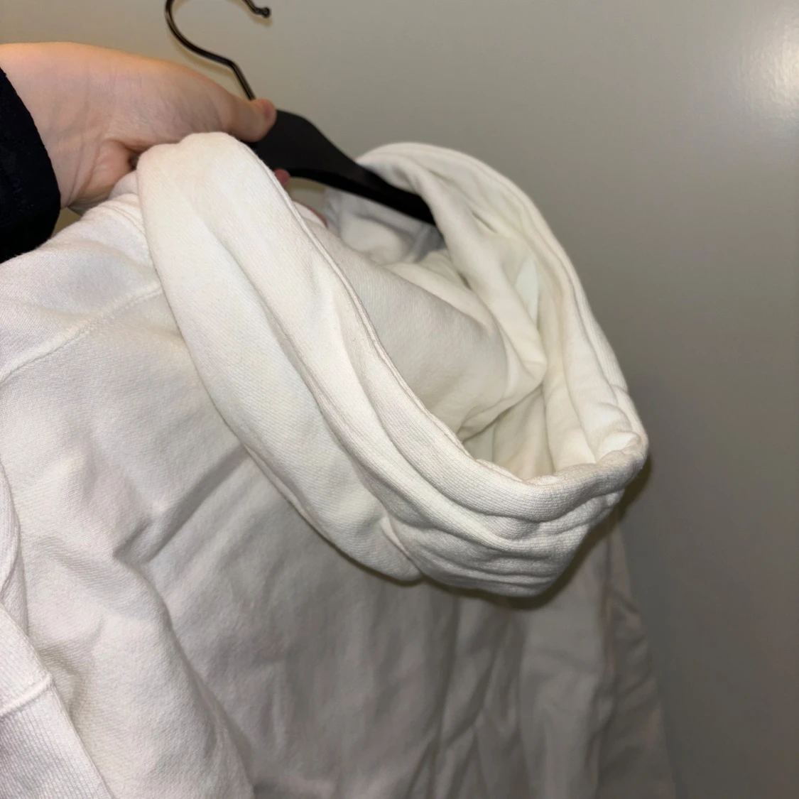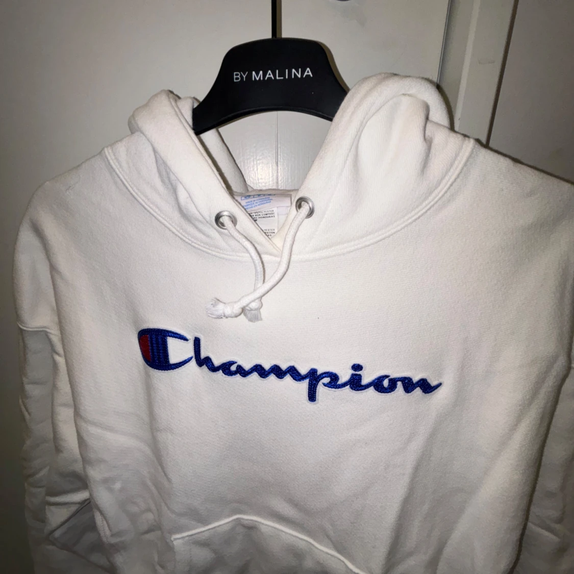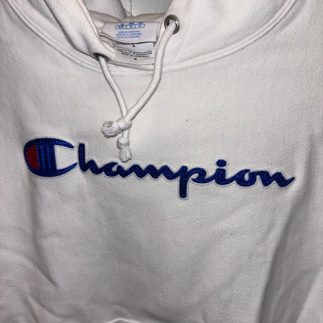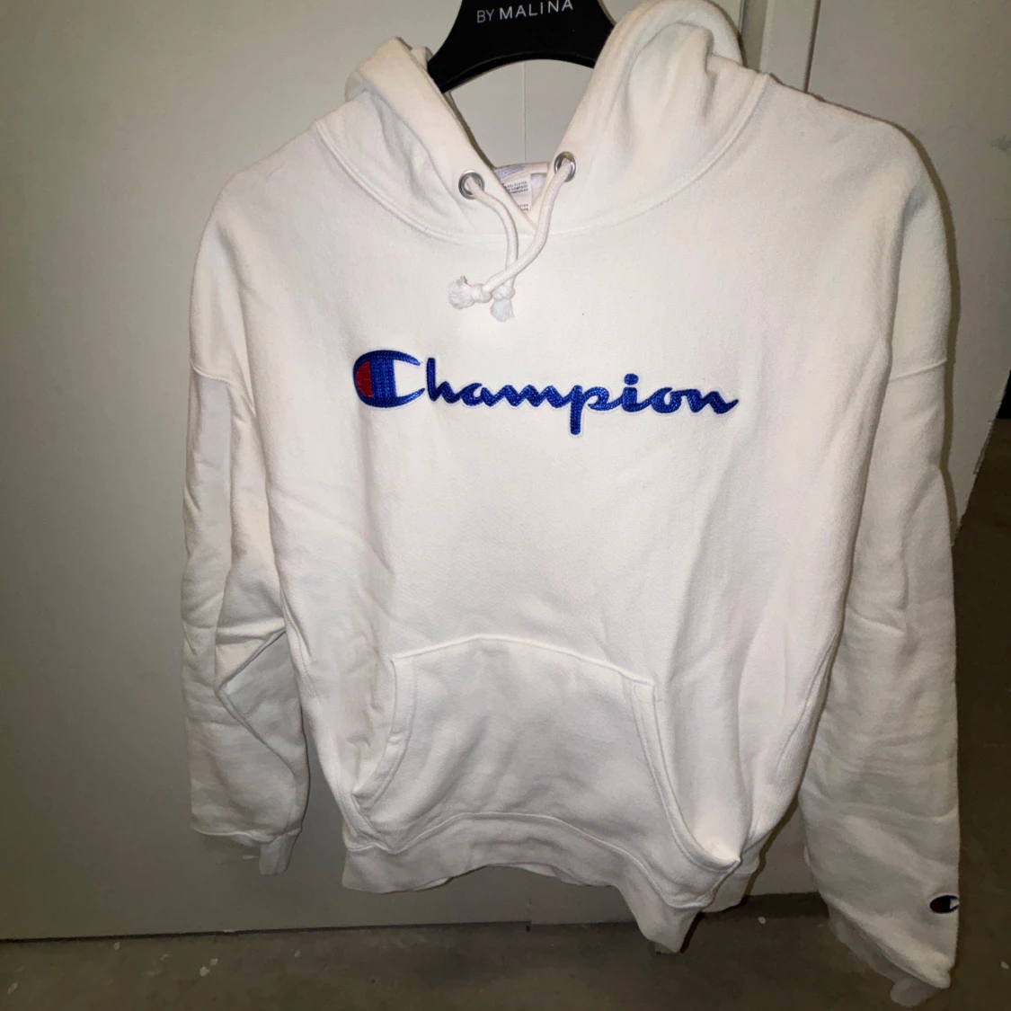 Säljer en klassisk vit hoodie från Champion med det ikoniska logotypbroderiet i blått och rött på bröstet. Hoodien har en känguruficka och justerbar dragsko i huvan. Perfekt för en avslappnad stil.