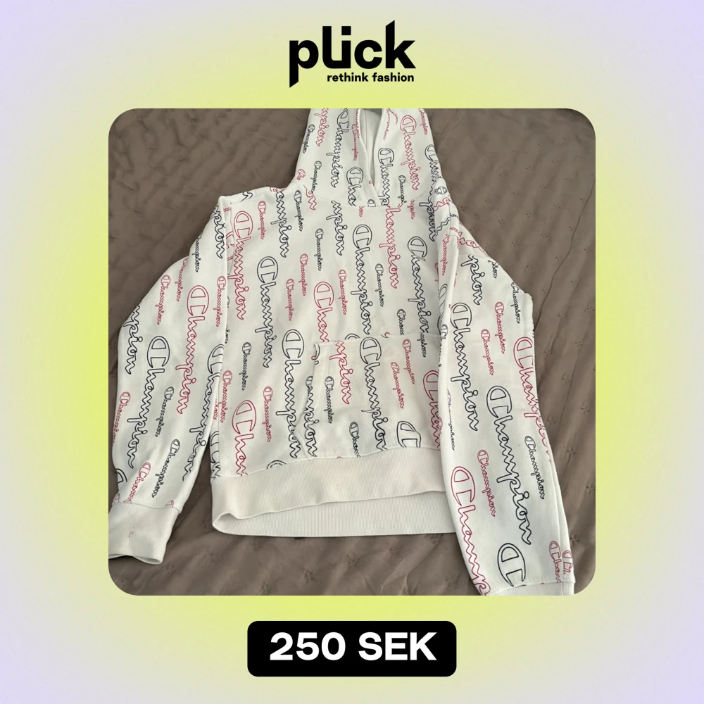 Säljer en snygg vit hoodie från Champion med deras ikoniska logga i rött och svart över hela tröjan. Den är supermjuk och perfekt för kyliga dagar. Hoodien har en klassisk passform med ribbade muddar och en stor ficka fram. Perfekt för både vardag och chill! 🖤❤️