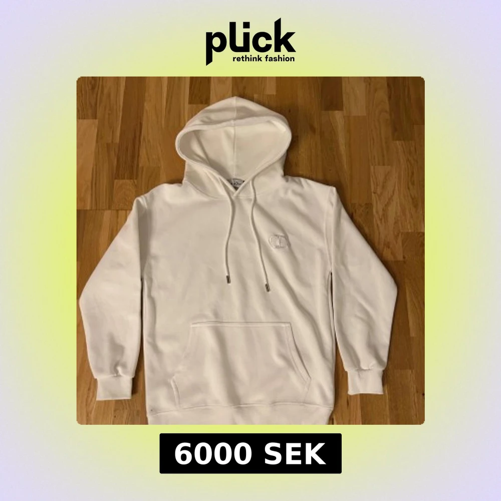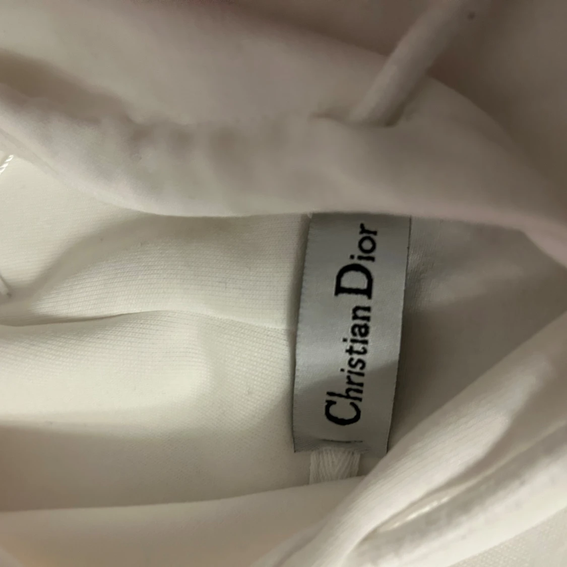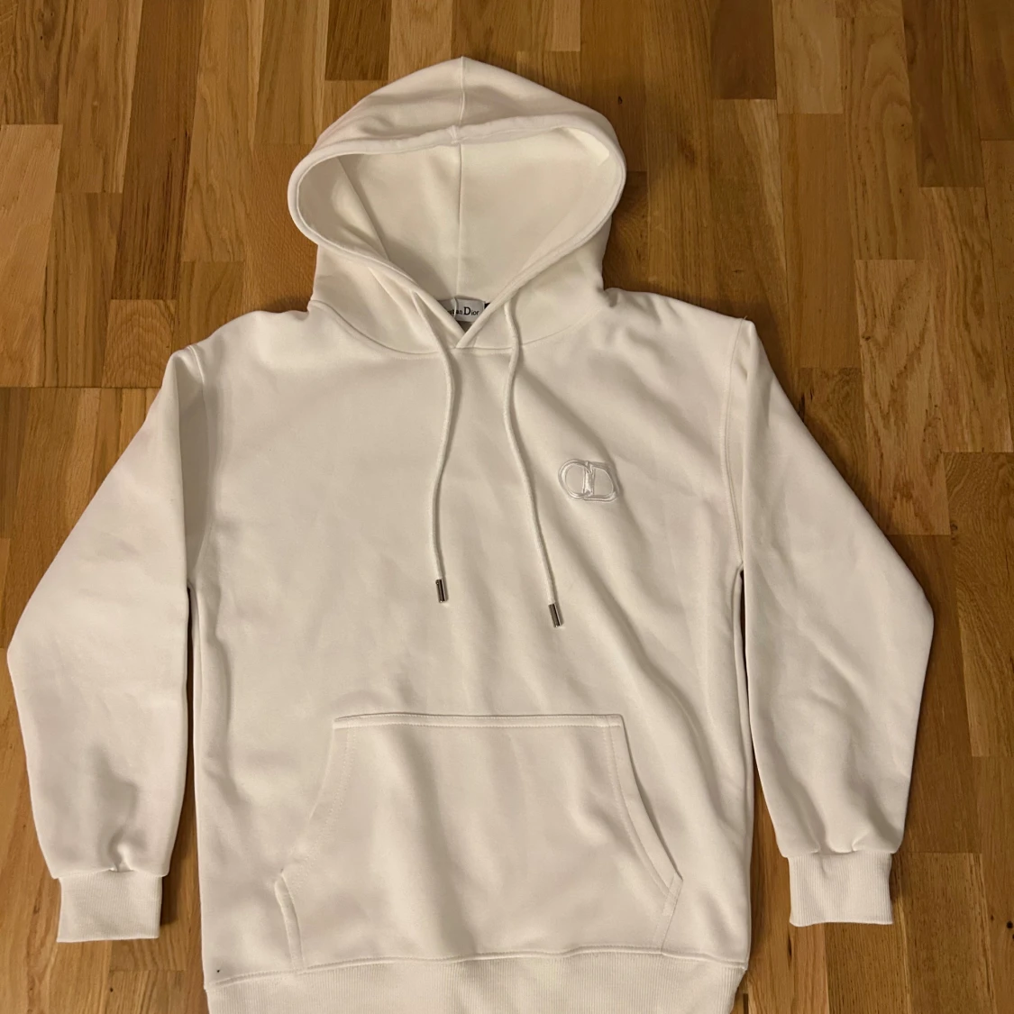 Säljer en clean vit hoodie från Christian Dior med broderad logga på bröstet. Tröjan har huva med snörning, känguruficka och långa ärmar. Perfekt för dig som gillar stilrena och exklusiva plagg.