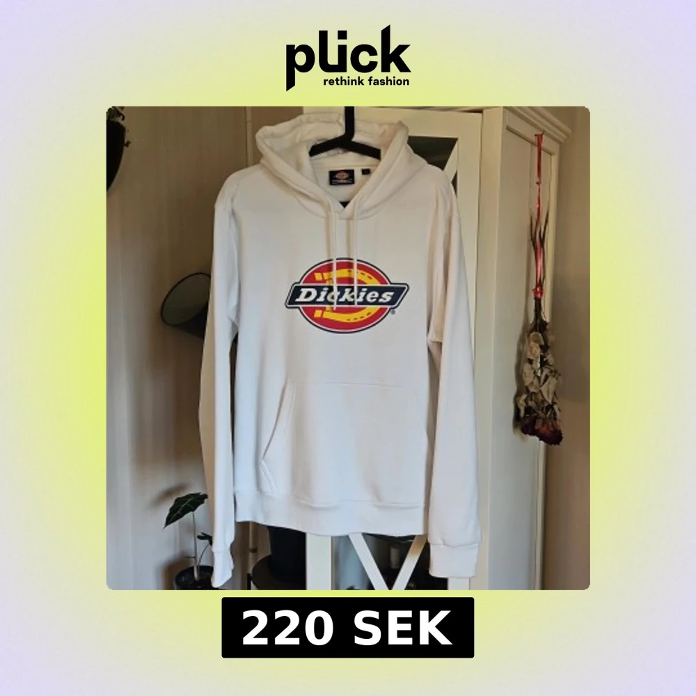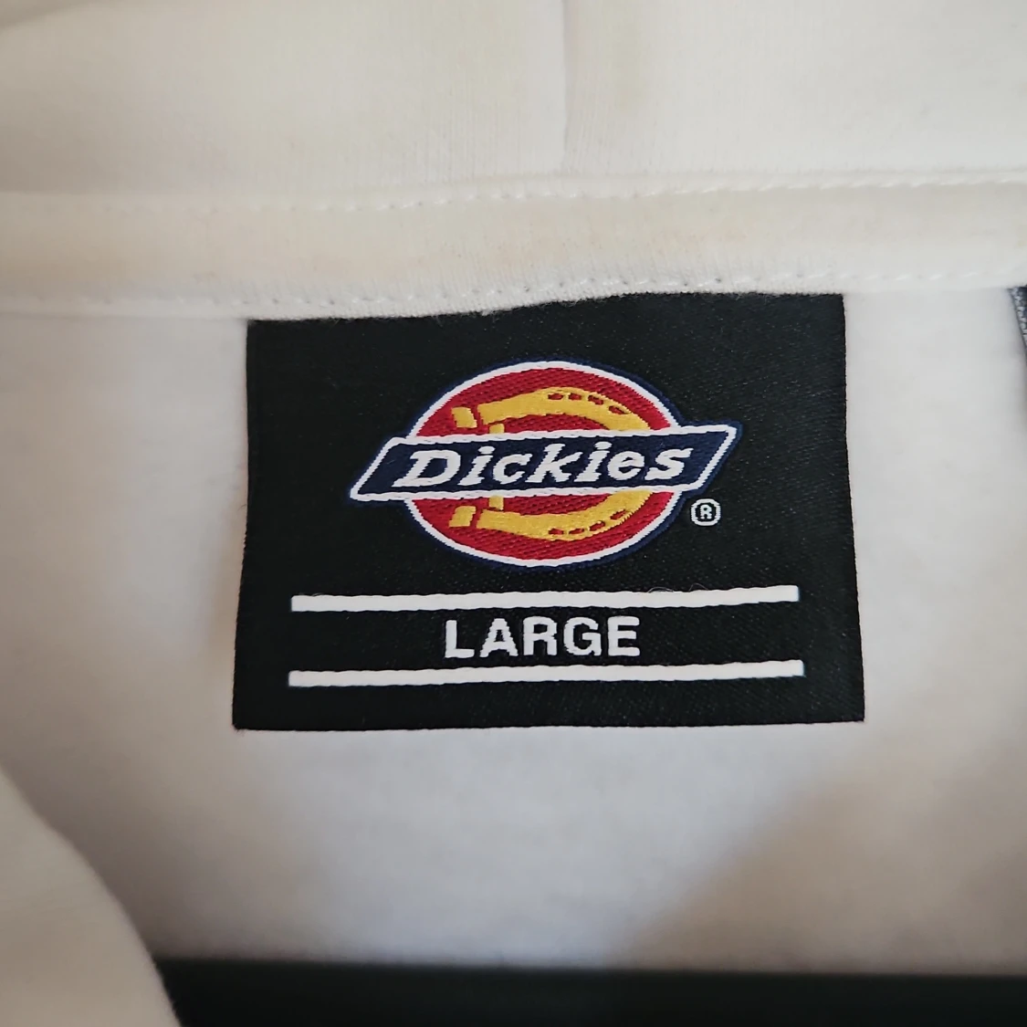 Säljer en clean vit hoodie från Dickies i storlek L. Klassisk modell med stor logga framtill, huva med snörning och känguruficka. Perfekt för dig som gillar streetwear och vill ha en enkel men snygg look.