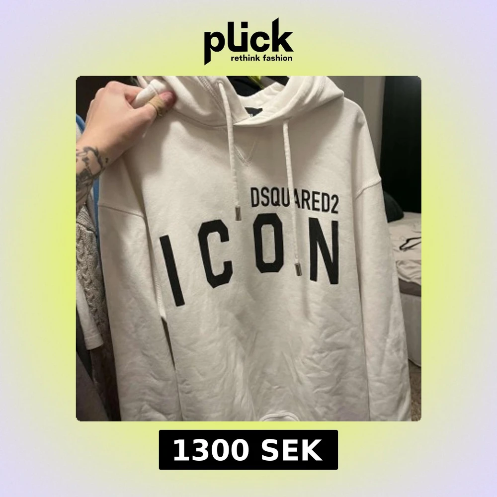 Säljer en vit hoodie från Dsquared2 med stor svart 'ICON'-text framtill. Tröjan har huva med snörning och långa ärmar. Oversized fit och tillverkad i mjuk bomull. Perfekt statement-plagg för dig som gillar streetstyle.