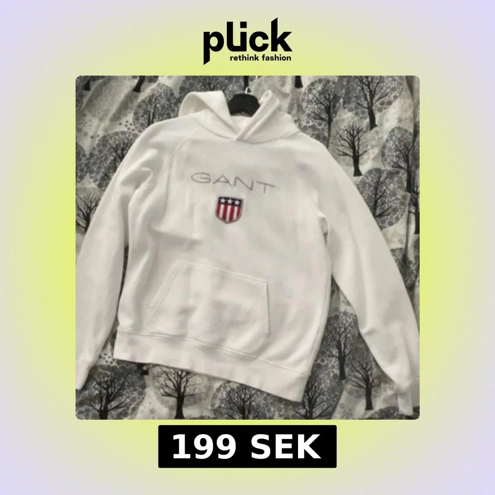 Säljer en stilren vit hoodie från GANT med broderad logga och ett emblem på bröstet. Tröjan har en klassisk känguruficka och är perfekt för en avslappnad stil. Passar för ungdomar runt 15 år.