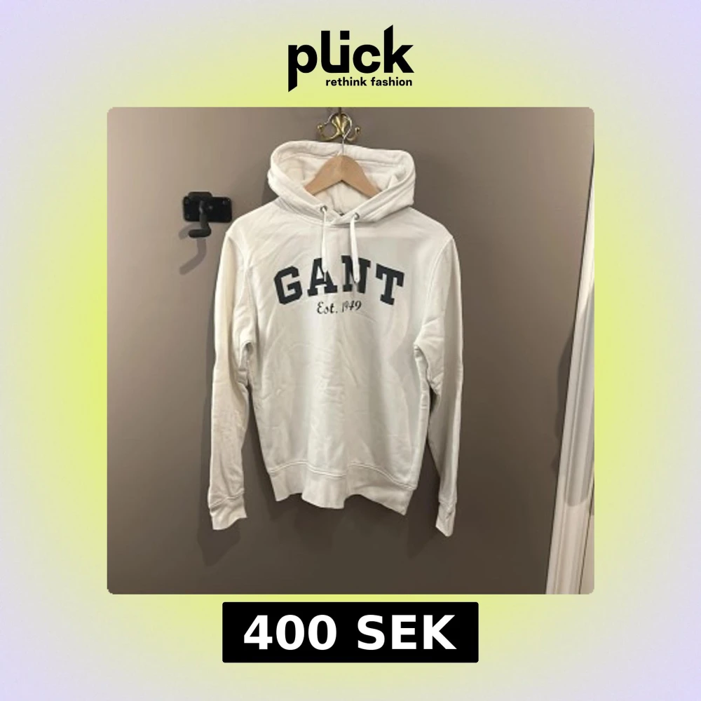 Säljer en vit hoodie från GANT med tryck på framsidan. Den har en klassisk design med huva och snören för att kunna dra åt huvan. Perfekt för en avslappnad stil. Det ska dock tilläggas att det finns en större fläck på baksidan då plagget är använt ett stort antal gånger. Storleken är M men sitter som S