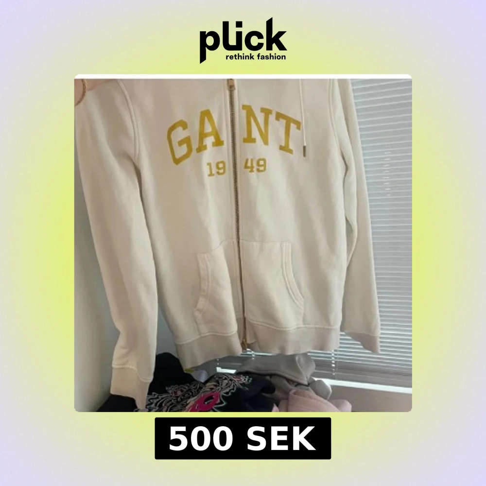 Säljer en stilren vit hoodie från GANT med dragkedja och gul text 'GANT 1949' på bröstet. Tröjan har långa ärmar och praktiska fickor framtill. Perfekt för en avslappnad look.