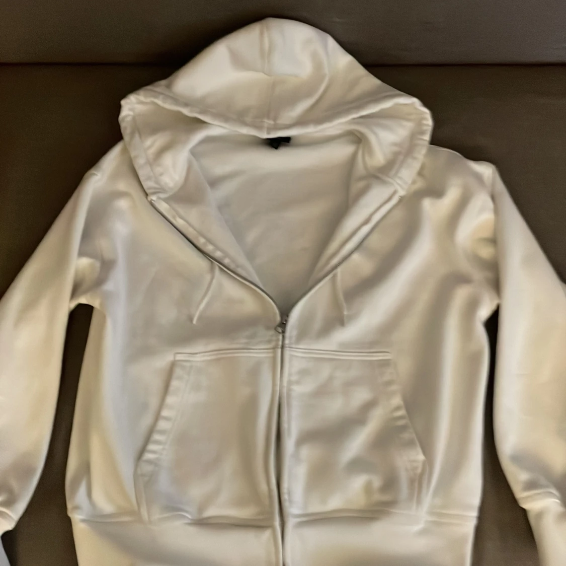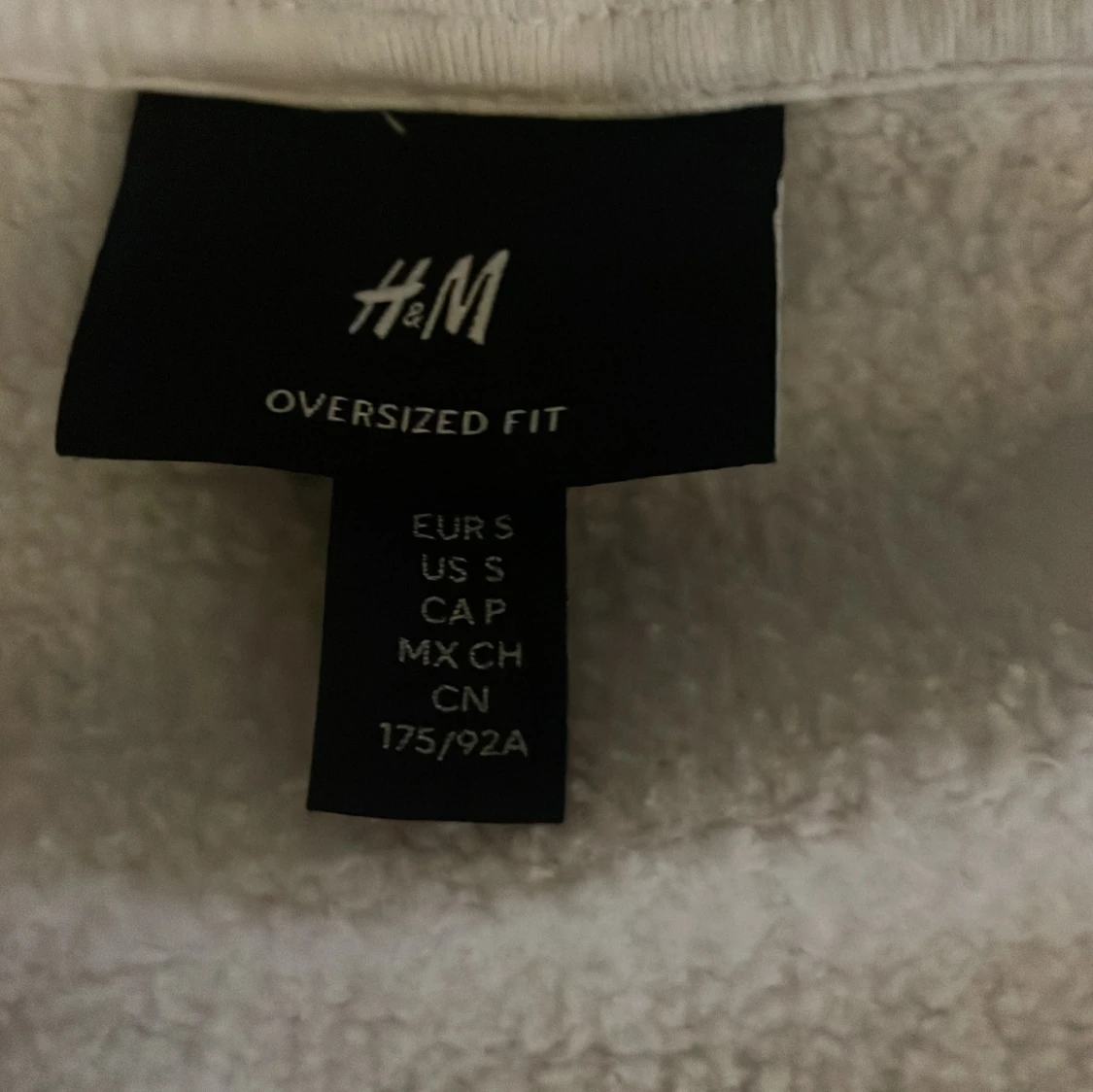 Säljer en stilren vit hoodie från H&M i oversized passform. Den har en praktisk dragkedja framtill och en stor huva. Perfekt för en avslappnad look. 🕶️