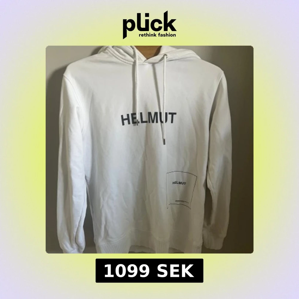 Vit hoodie från Helmut med svart tryck på bröstet och nedtill på magen. Tröjan är i strl M. Skriv om ni undrar något