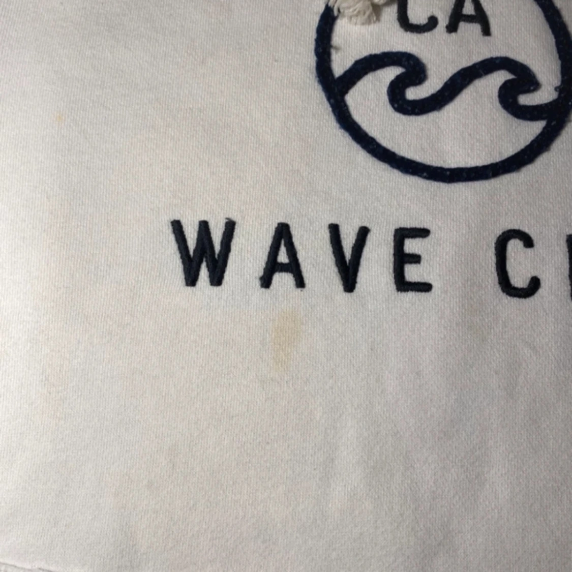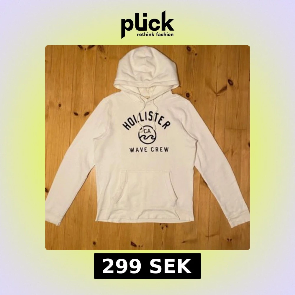 Säljer en vit hoodie från Hollister med svart tryck 'Wave Crew' och vågmotiv på bröstet. Tröjan har huva med snörning, känguruficka och långa ärmar med ribbade muddar. Mjuk bomullskänsla, perfekt för chill dagar. Passar dig som gillar enkel och clean stil. Har lite fläckar därför neddraget pris