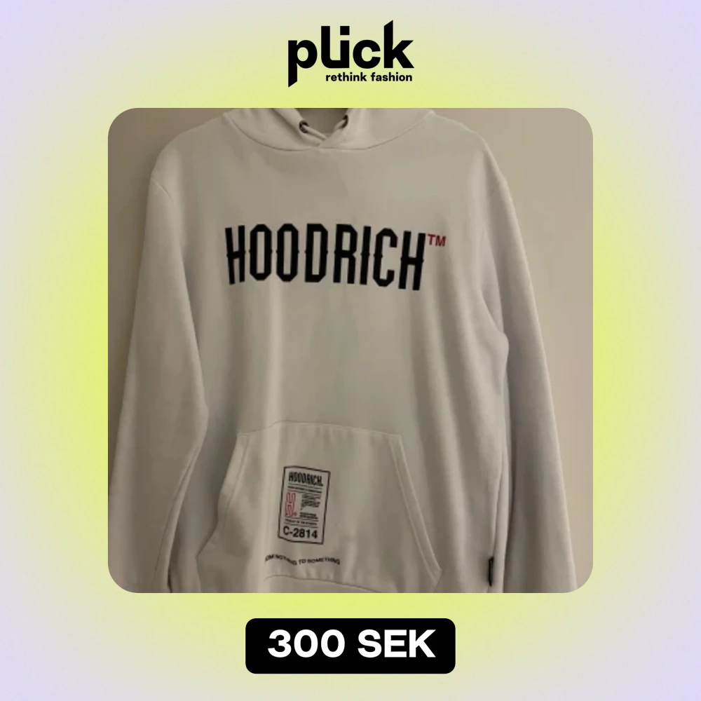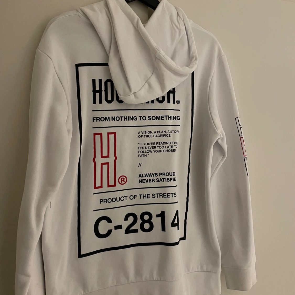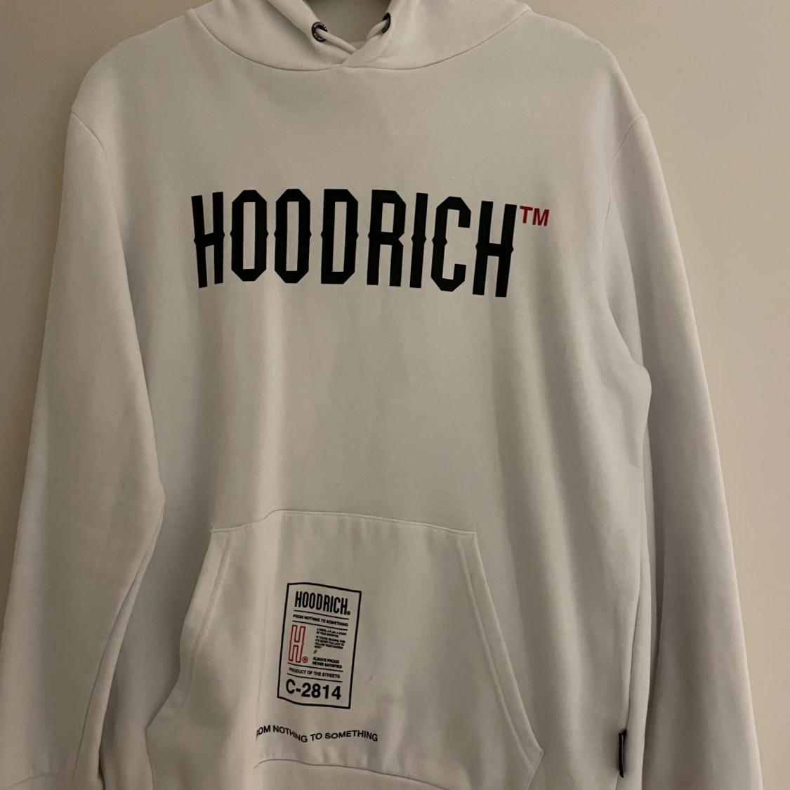 Säljer en snygg vit hoodie från Hoodrich med tryck både fram och bak. Perfekt för en casual look eller streetwear-stil. Den är i bra skick och redo för nya äventyr!