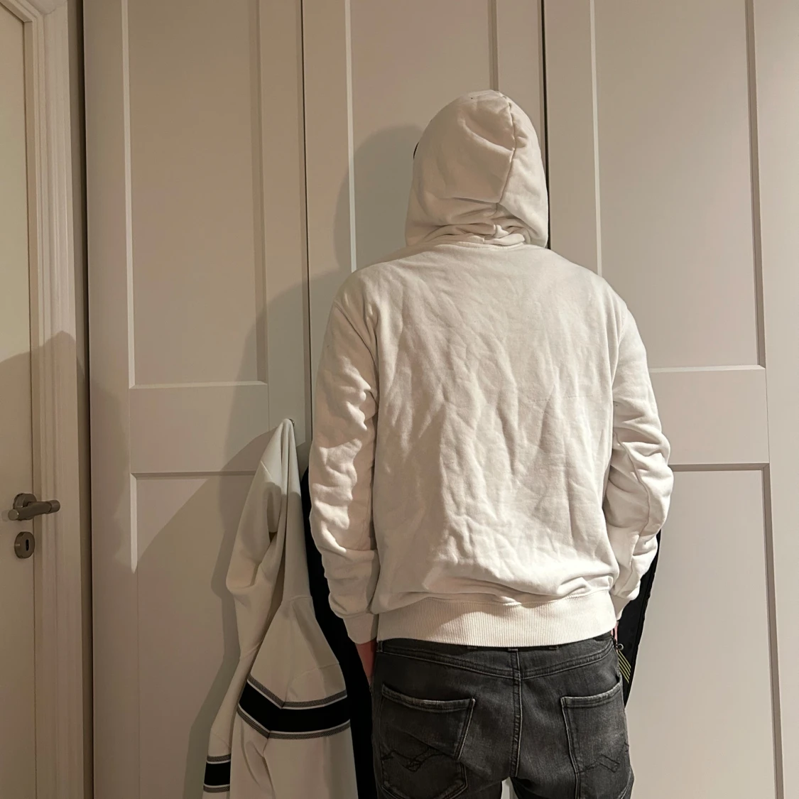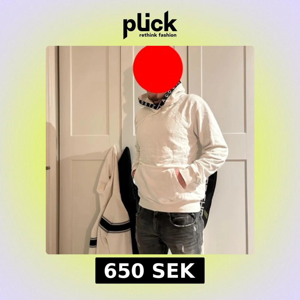 Säljer en stilren vit hoodie från Lacoste med stor huva och tryckt logga på kragen. Tröjan har en klassisk känguruficka framtill och ribbade muddar vid ärmslut och nederkant. Perfekt för en avslappnad look.
