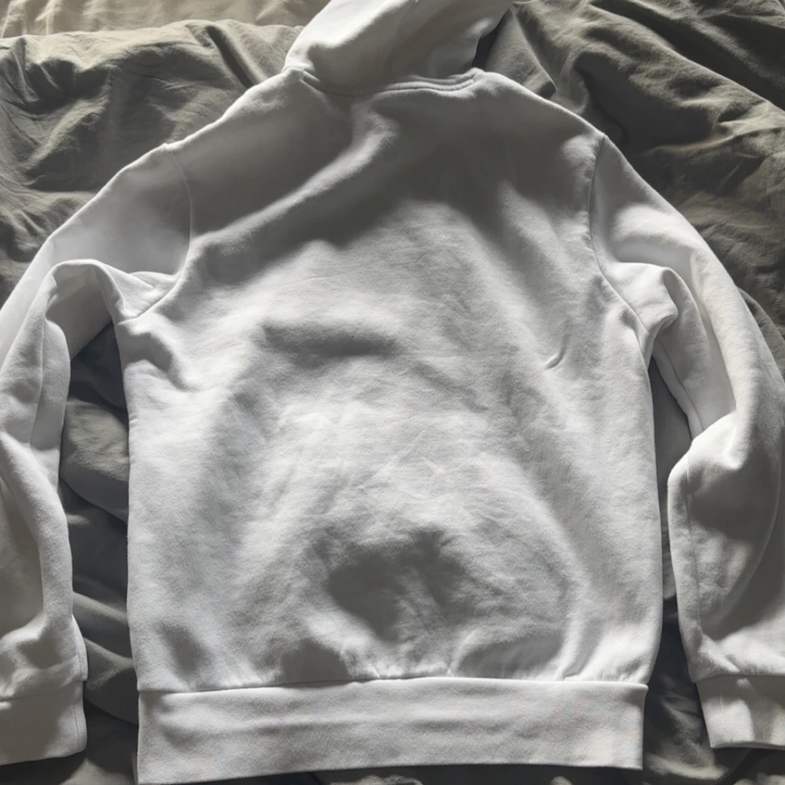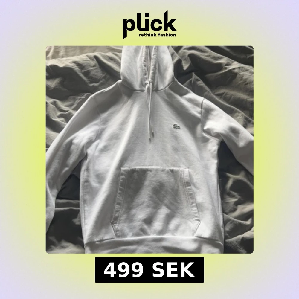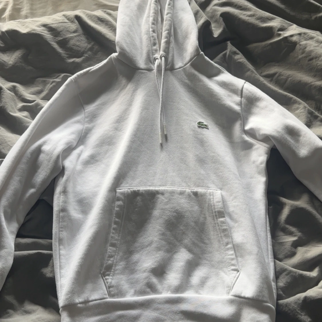 Säljer en klassisk vit hoodie från Lacoste med broderad logga på bröstet. Tröjan har huva med dragsko och en stor magficka framtill. Perfekt för en clean och stilren look. Inte en synlig fläck på tröjan då den typ är helt ny.