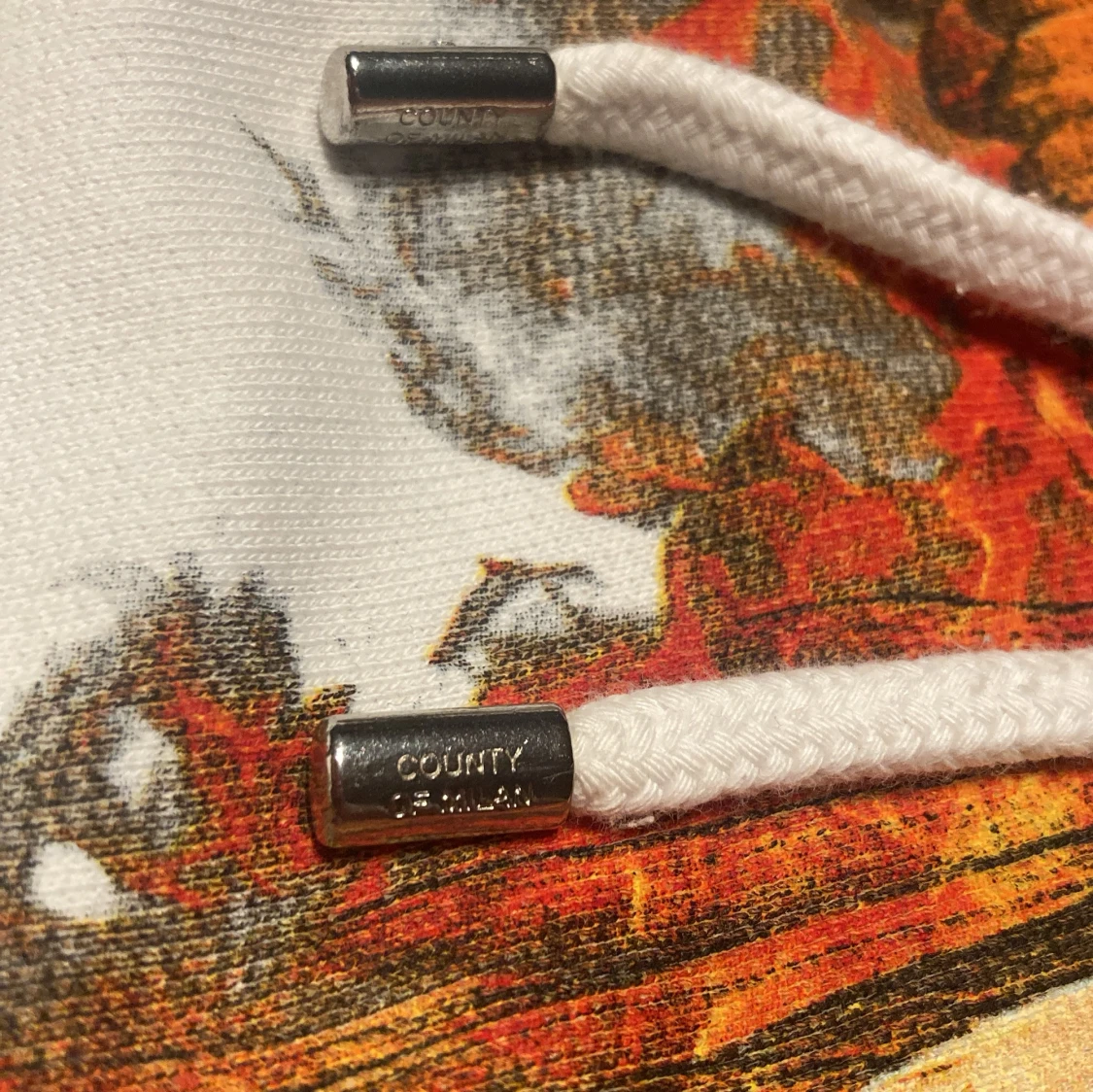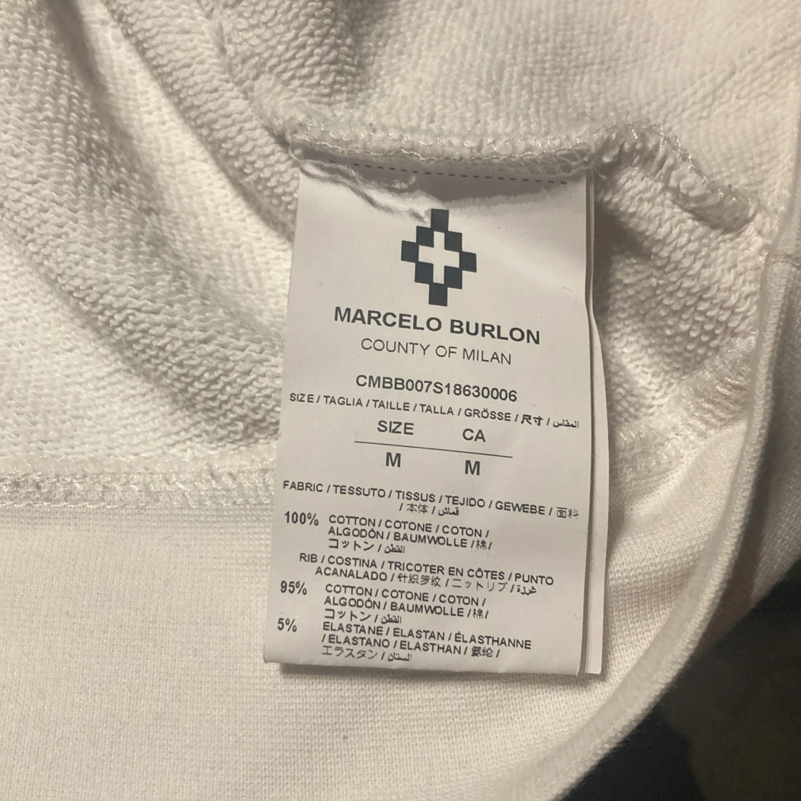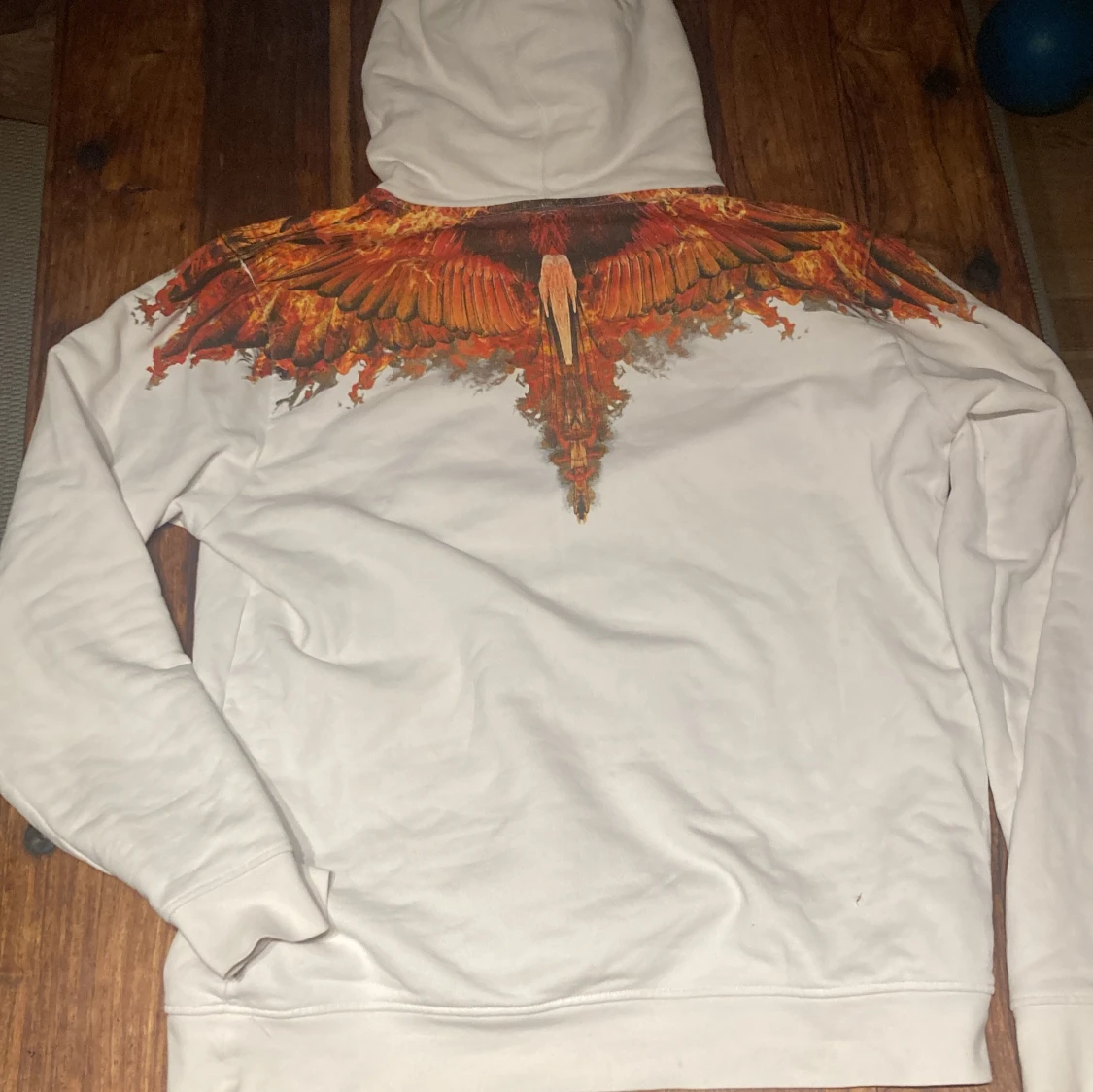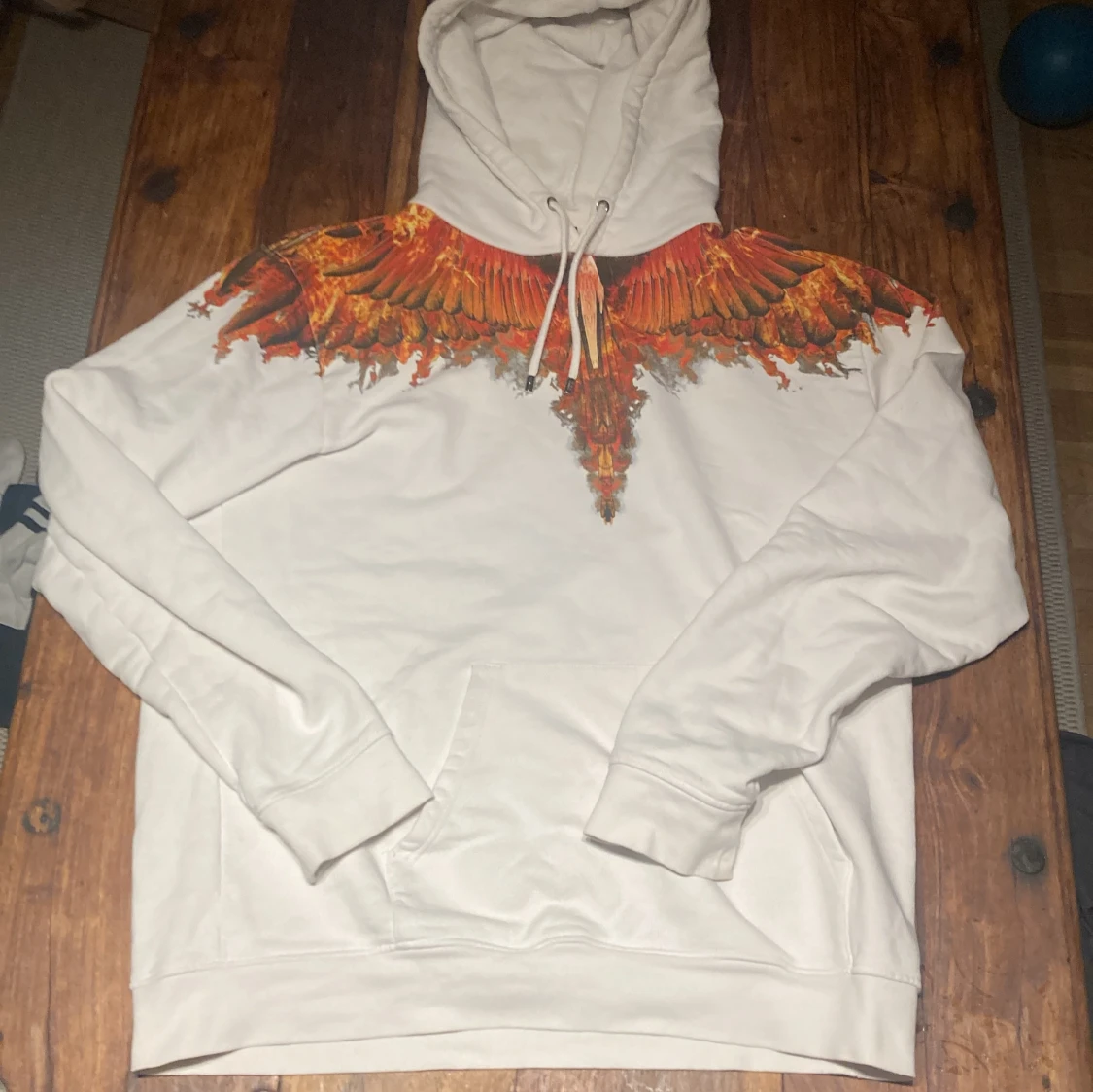 Säljer en as fet vit hoodie från Marcelo Burlon med ett coolt orange och rött vingmönster över axlarna. Hoodien har en normal passform med snören i huvan. Väldigt bra skick. Perfekt för en stilren look! Kom gärna med bud!