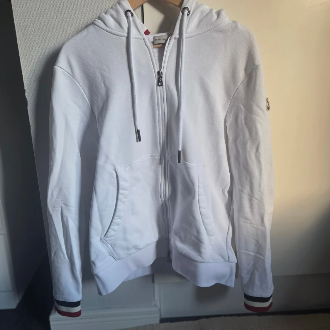 Vit hoodie från Moncler med huva och snörning, dragkedja framtill och två fickor. Ribbade muddar med röd, blå och vit rand på ärmslut och huva. Moncler-logga på vänster ärm. Tillverkad i mjuk bomull, perfekt för chill dagar.