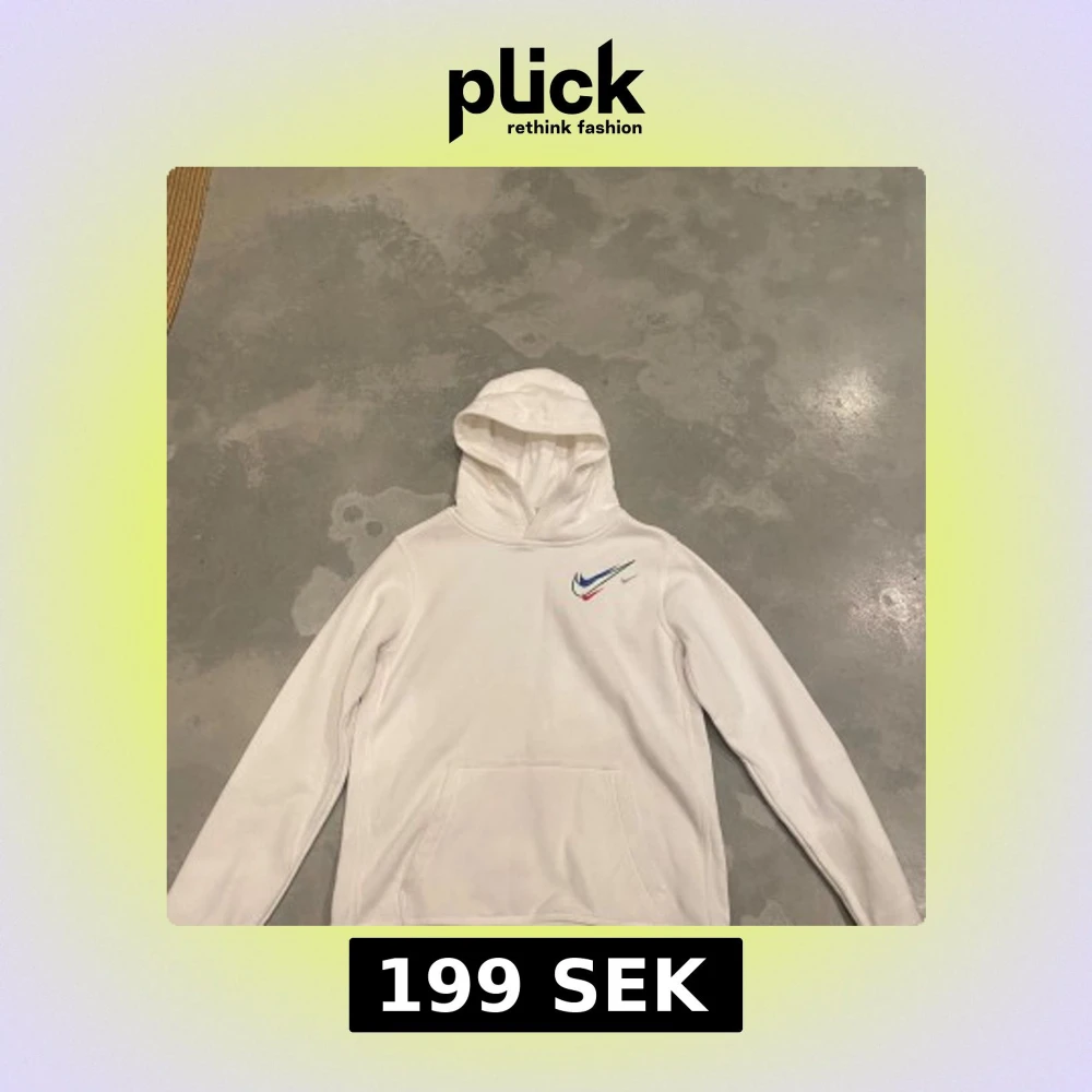 Säljer en clean vit hoodie från Nike med flera färgglada swoosh-loggor på bröstet i blått, grönt, rött och silver. I STORLEK 158-170 CM. Tröjan har huva och en stor magficka. Perfekt för dig som gillar sportig och stilren streetwear.