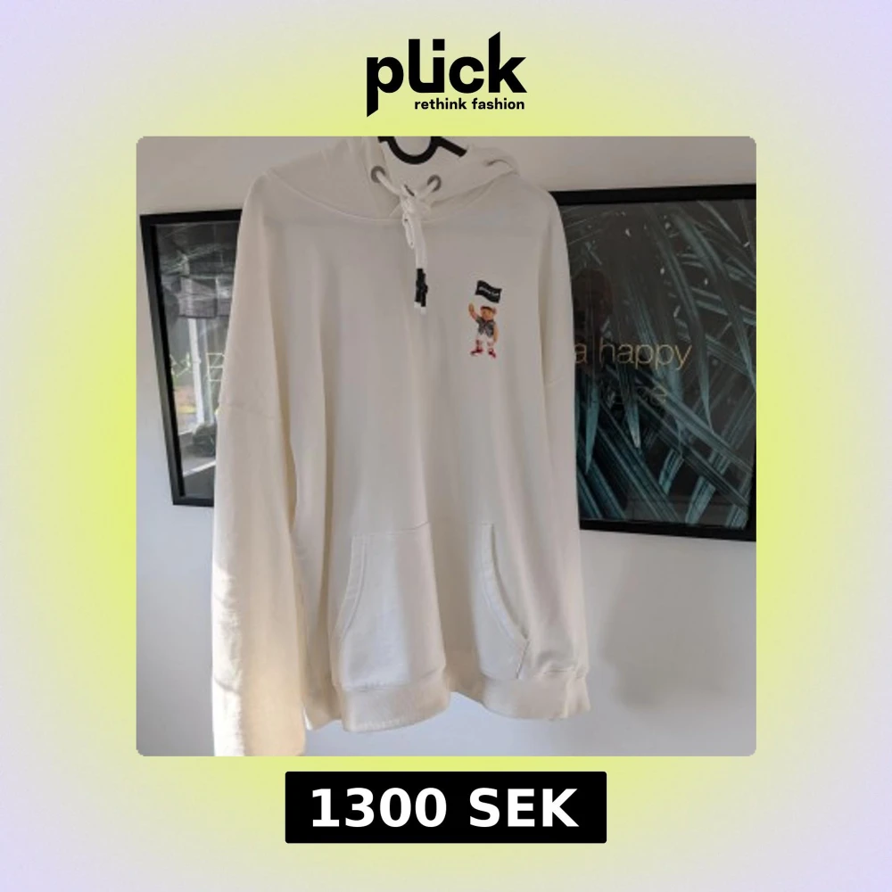 Säljer en vit hoodie från Palm Angels med svart text på framsidan och en söt nalle med flagga på baksidan. Hoodien har en stor ficka framtill och justerbar dragsko i huvan. Perfekt för en avslappnad stil!