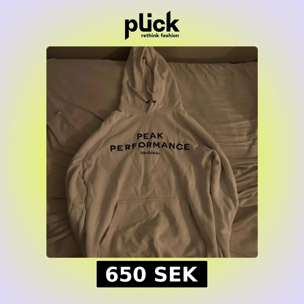 Säljer en stilren vit hoodie från Peak Performance med svart text på bröstet. Den har en klassisk design med en stor ficka framtill och justerbar huva med snören. Perfekt för en avslappnad look.
