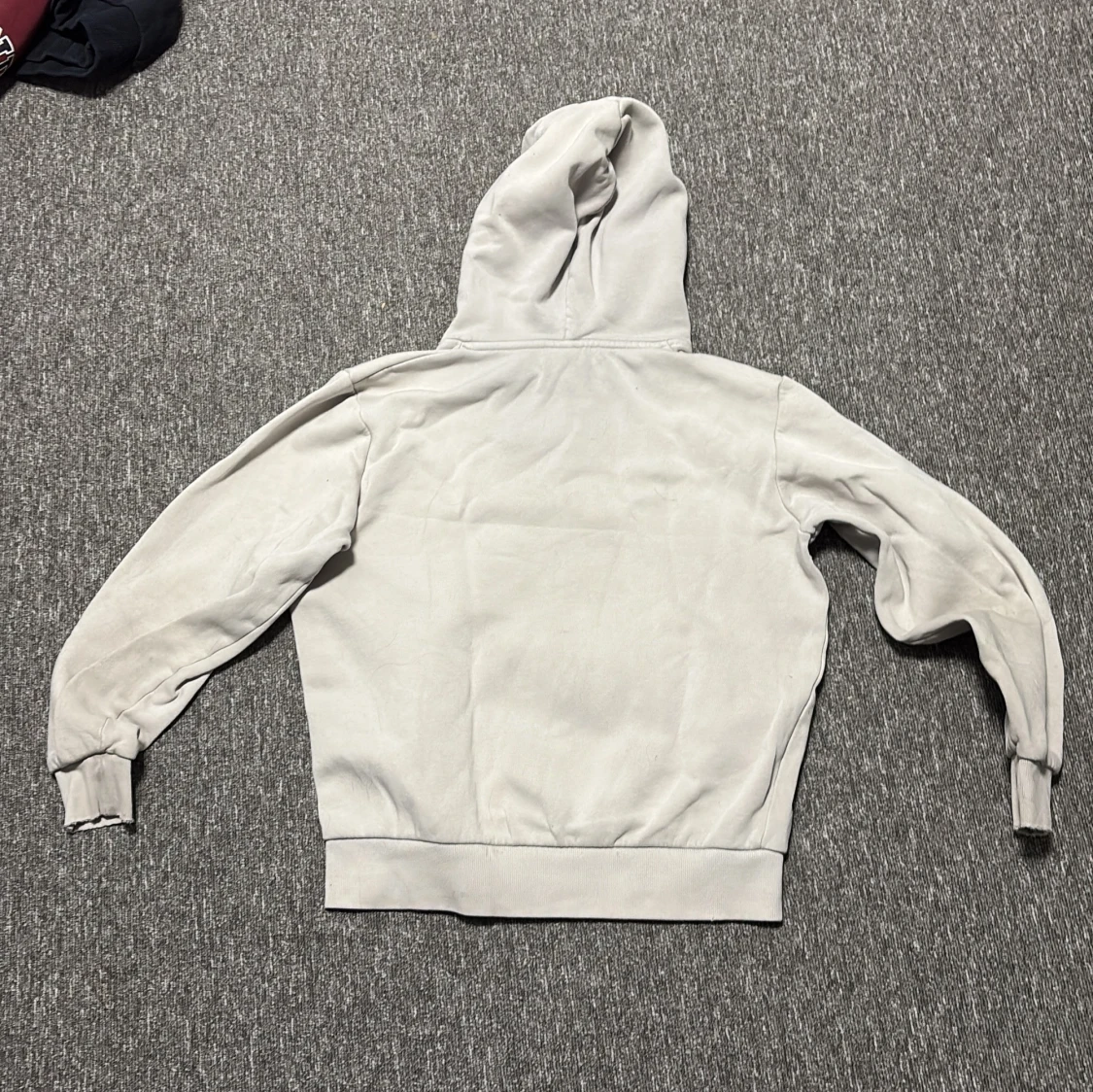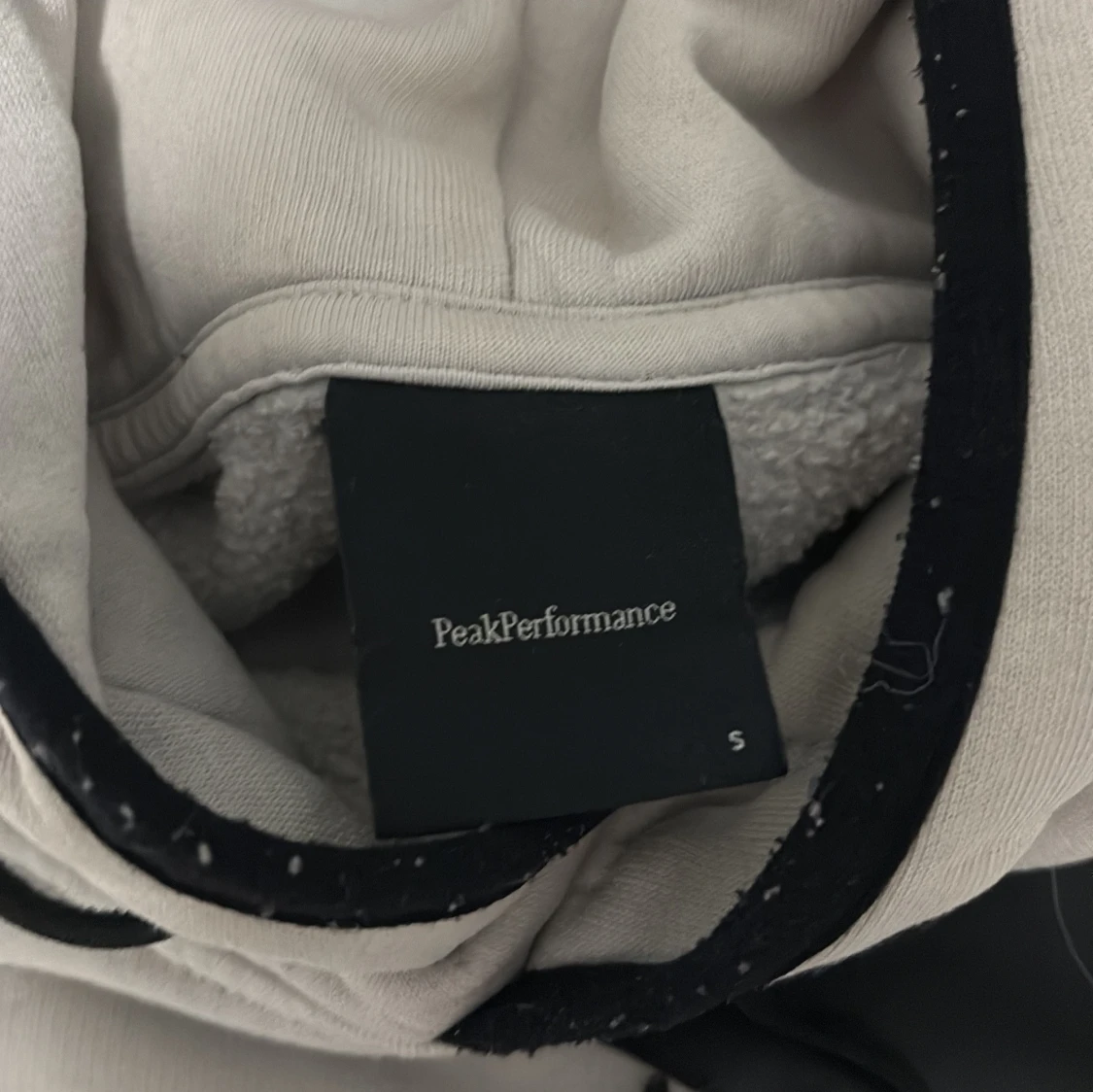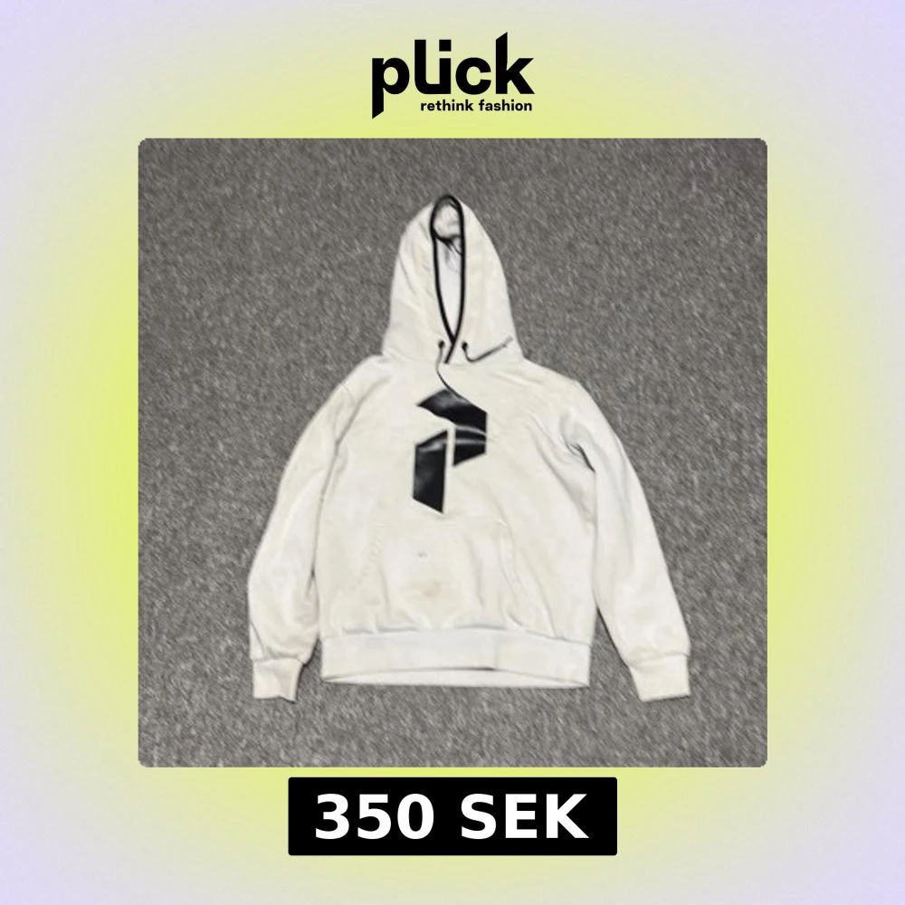 Vit hoodie från Peak Performance med svart logga framtill. Klassisk känguruficka, snörning i huvan och ribbade muddar. Finns en liten svart fläck på framsidan Ni står för frakt!