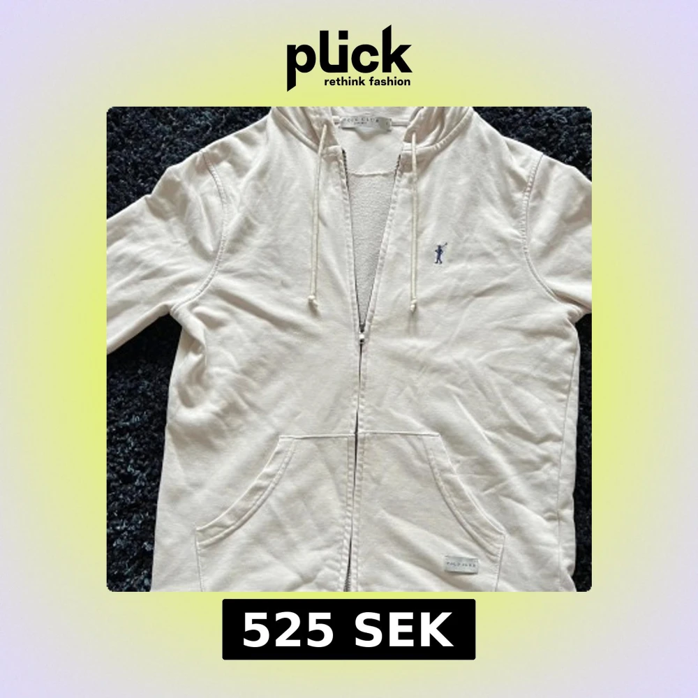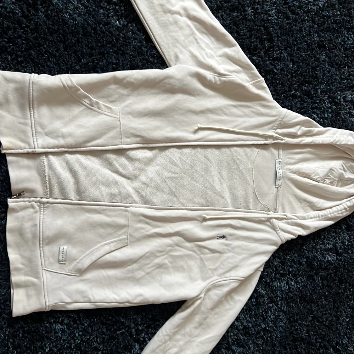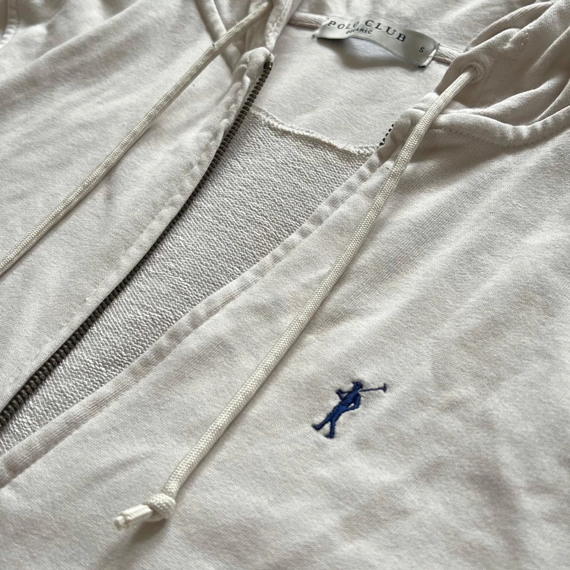 Snygg vit hoodie från Polo Club med dragkedja, huva med snörning och två stora fickor framtill. Broderad blå logga på bröstet. Tillverkad i mjuk bomull, perfekt för chill dagar. Klassisk och enkel design som funkar till det mesta. Använt ett par gånger, men inget som påverkat utseendet.