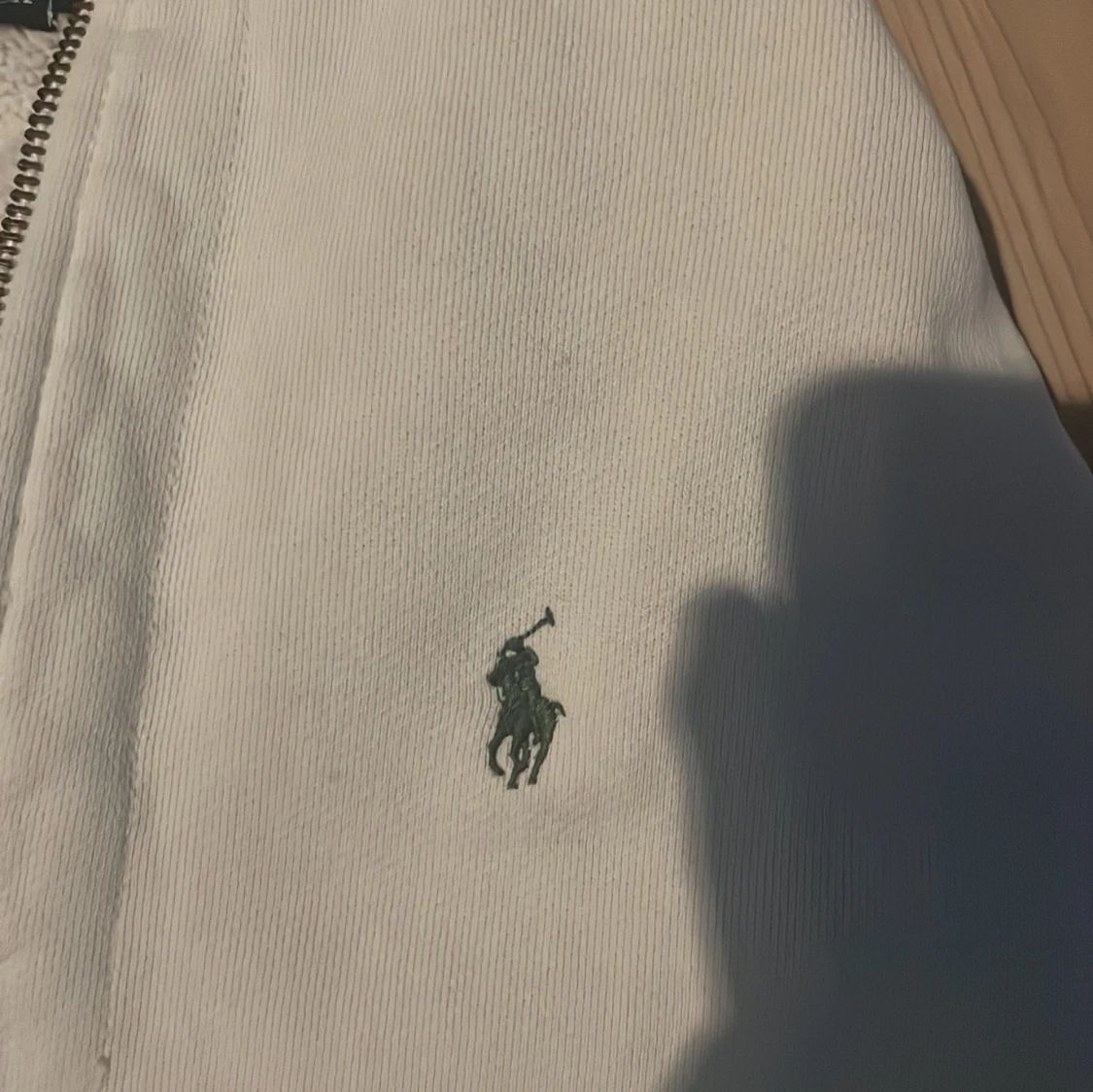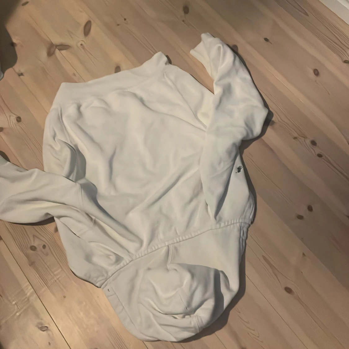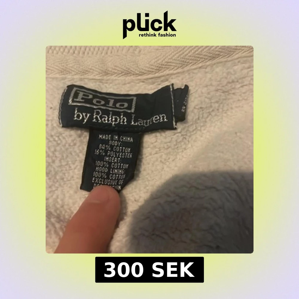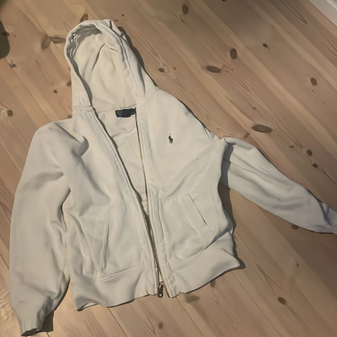 Säljer en stilren vit hoodie från Polo Ralph Lauren med dragkedja och broderad logga på bröstet. Tillverkad i en mjuk bomullsblandning för extra komfort. Perfekt för en avslappnad look.