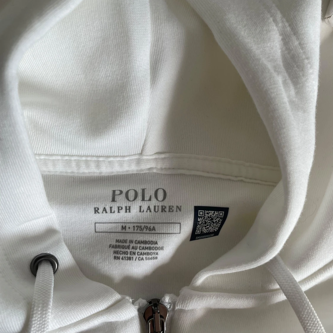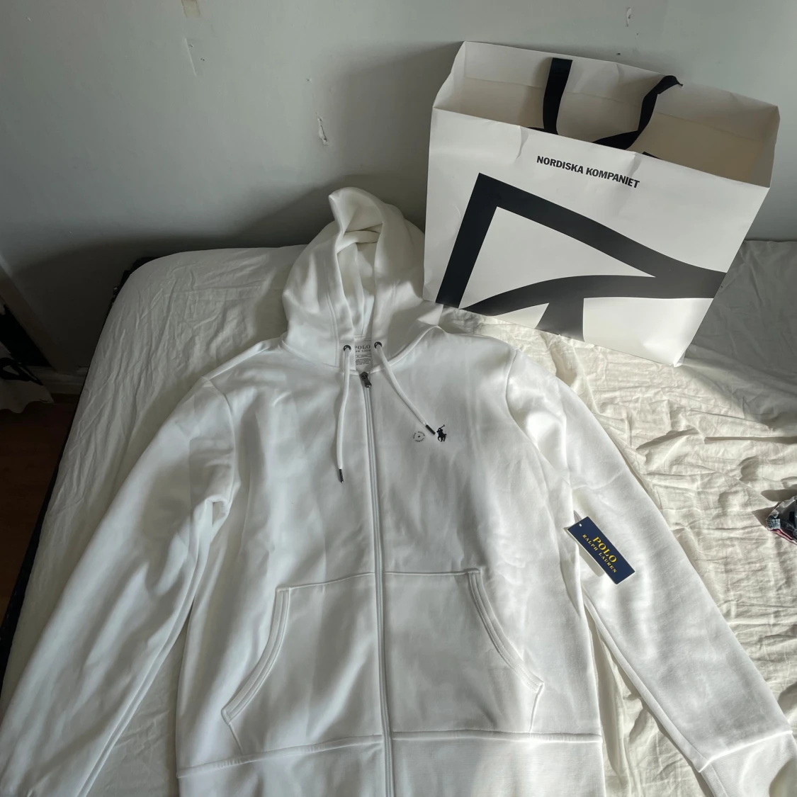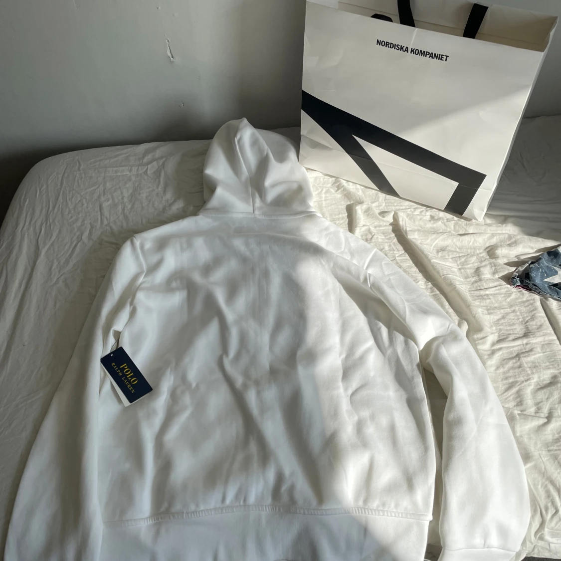 Snygg vit zip hoodie från Polo Ralph Lauren med dragkedja och klassisk logga på bröstet. Tröjan har huva med snörning, känguruficka och är tillverkad i mjuk bomull. Perfekt för en clean och stilren look. Köpte den från Nk i Göteborg för ca 3 månader sen. Alla prislappar och sånt är kvar. Aldrig använd bara testad en gång. Kom privat för mer info/bilder.😁
