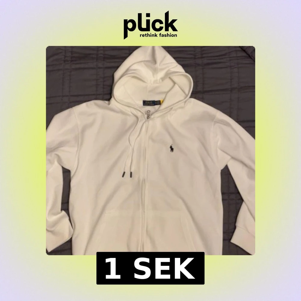 Vit hoodie från Polo Ralph Lauren i storlek XL. Sitter som en L. Tröjan har huva med snörning, dragkedja framtill och klassisk Polo-logga broderad på bröstet. Mjukt material och ribbade muddar vid ärmslut och nederkant. Perfekt för chill dagar.