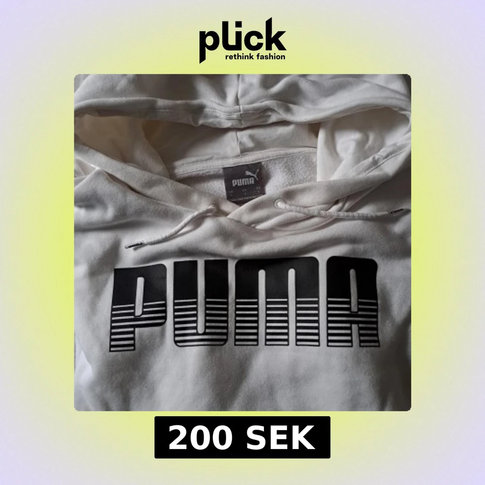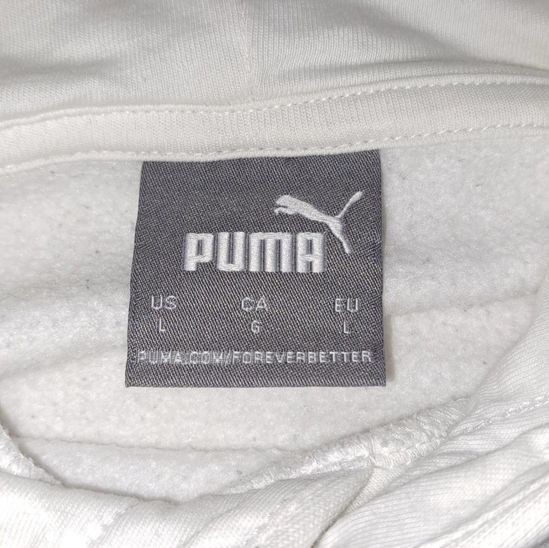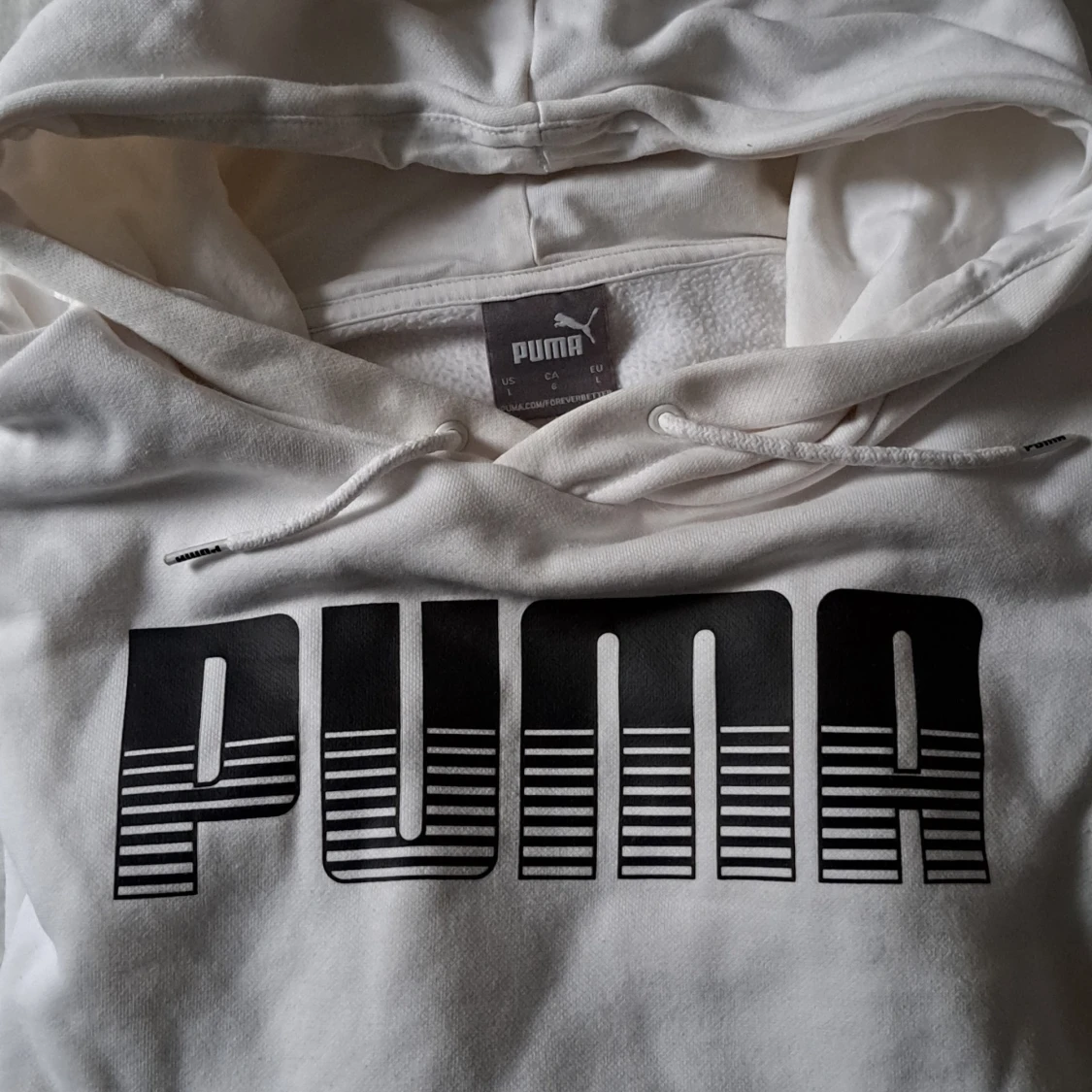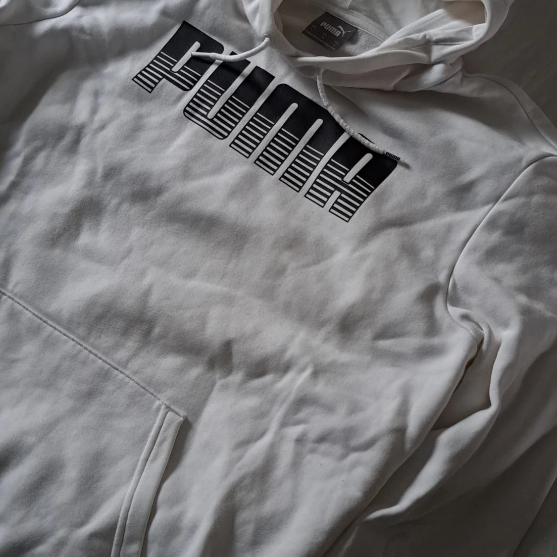 Säljer en vit hoodie från Puma i storlek L. Tröjan har en stor svart Puma-logga framtill, huva med snörning och en klassisk känguruficka. Perfekt för dig som gillar sportig och avslappnad stil.