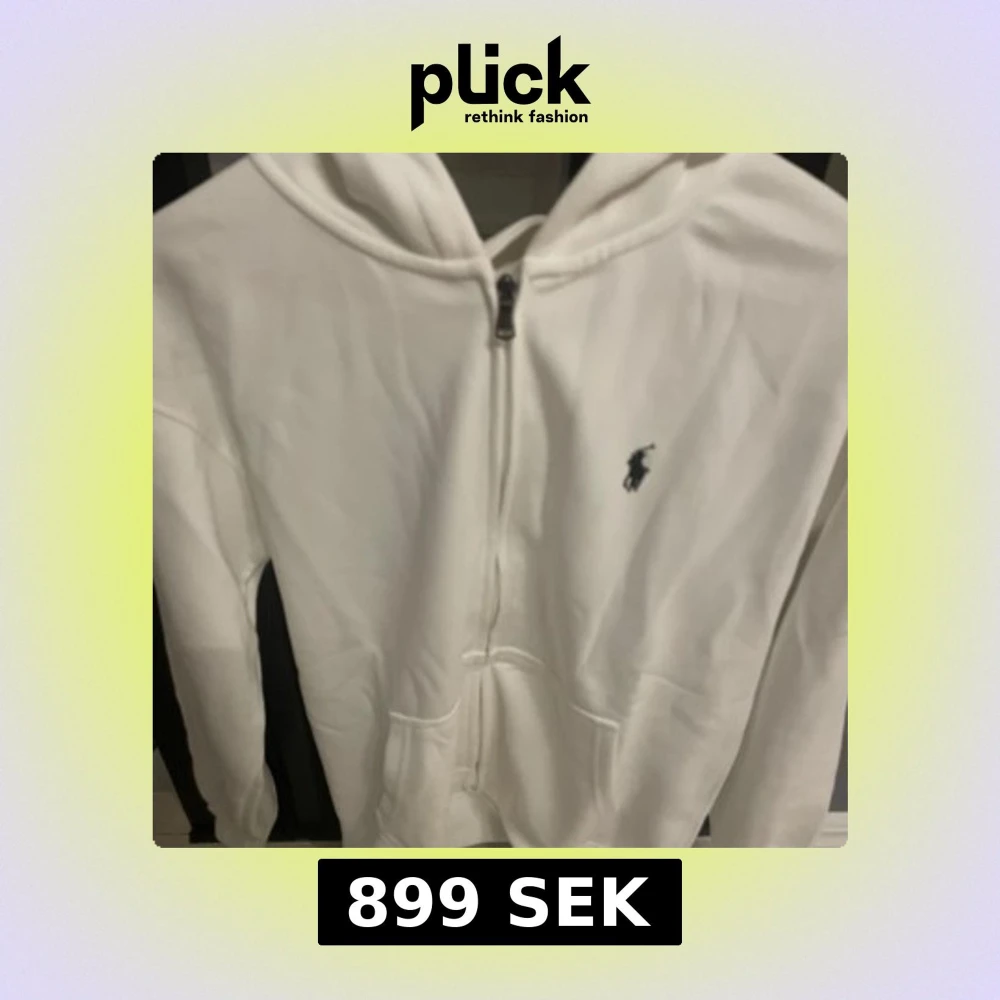 Säljer en stilren vit hoodie från Ralph Lauren med dragkedja och det klassiska logotypbroderiet på bröstet. Perfekt för en avslappnad look. Hoodien har långa ärmar och en bekväm passform.