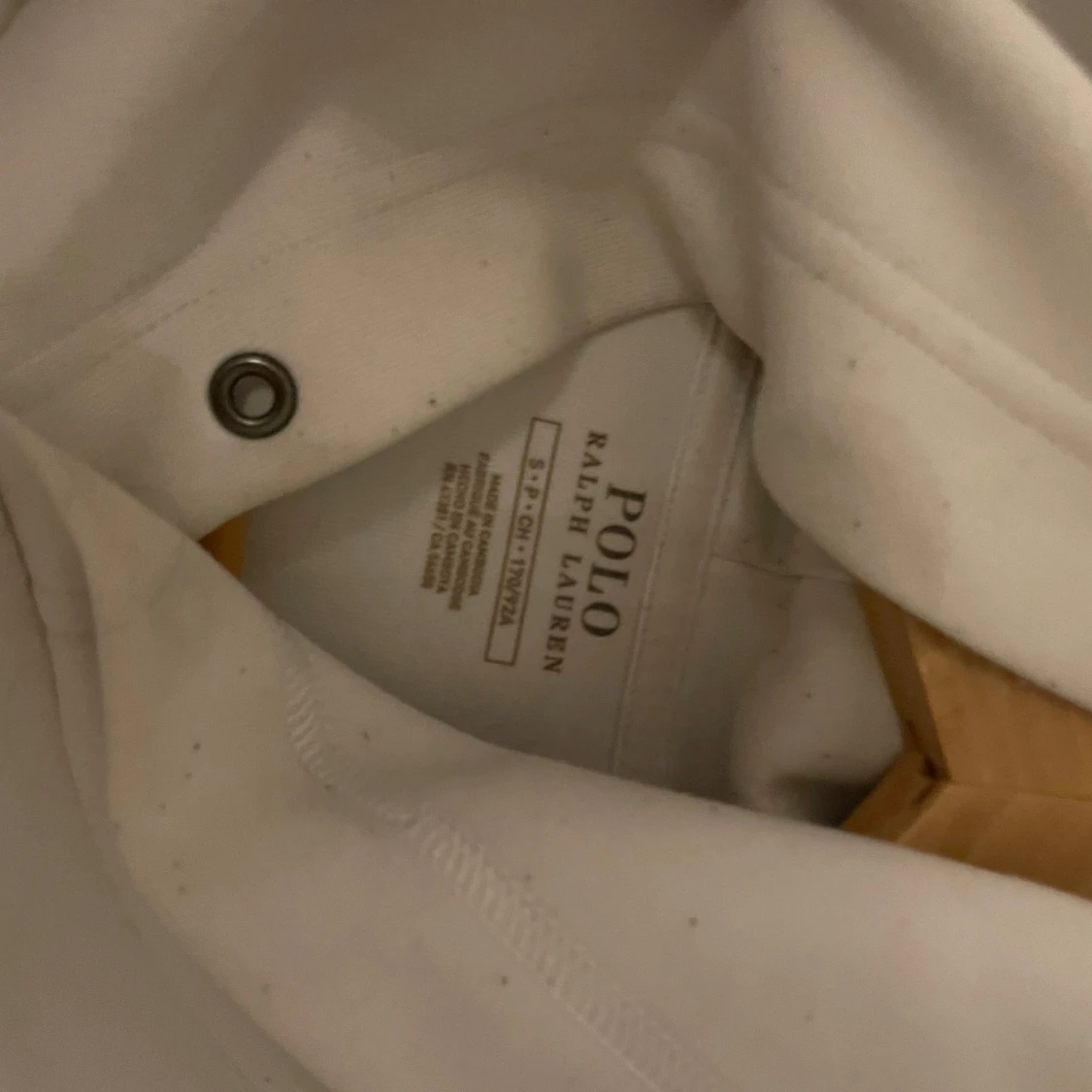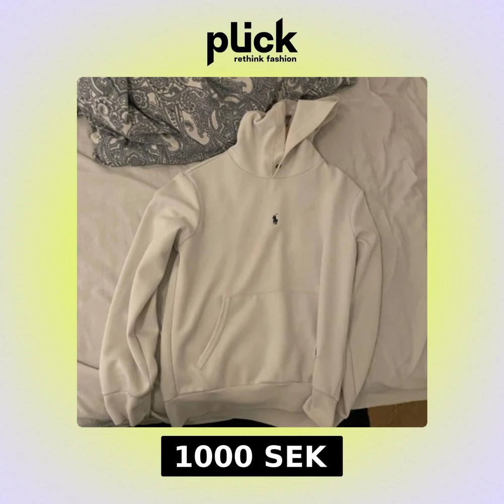 Säljer en stilren vit hoodie från Ralph Lauren med det klassiska logotypbroderiet på bröstet. Tröjan har en känguruficka och en bekväm huva. Perfekt för en avslappnad look.