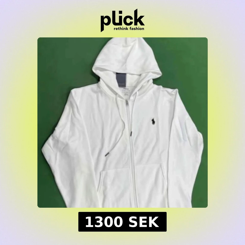Säljer en stilren vit hoodie från Ralph Lauren med dragkedja och klassisk logga på bröstet. Den har en justerbar huva och praktiska fickor framtill. Perfekt för en avslappnad look. Storlek medium. Hela dressen medföljer 1300kr kan fraktas eller mötas