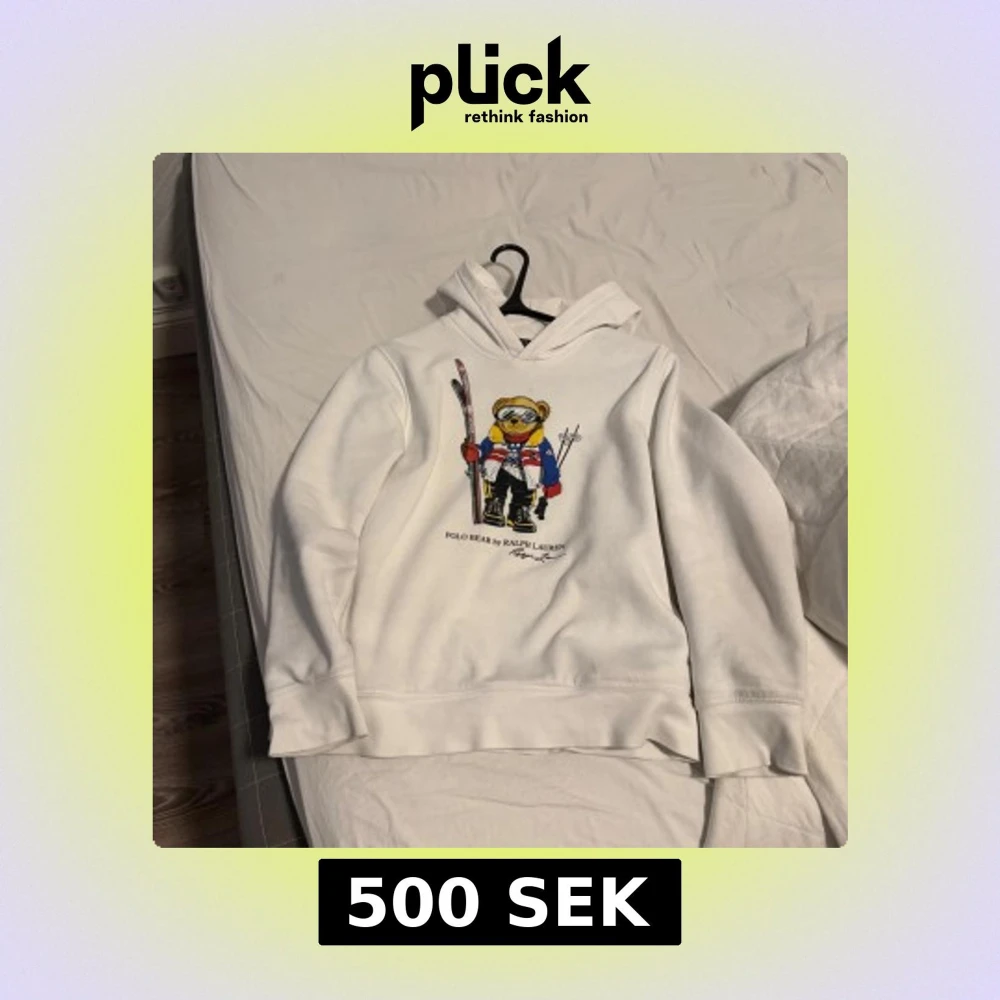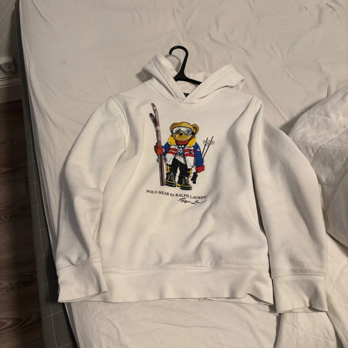 Säljer en vit hoodie från Ralph Lauren med ett coolt björnmotiv på framsidan. Perfekt för en avslappnad stil med en touch av lyx. Hoodien har långa ärmar och en klassisk huva. Passar perfekt för kyliga dagar.