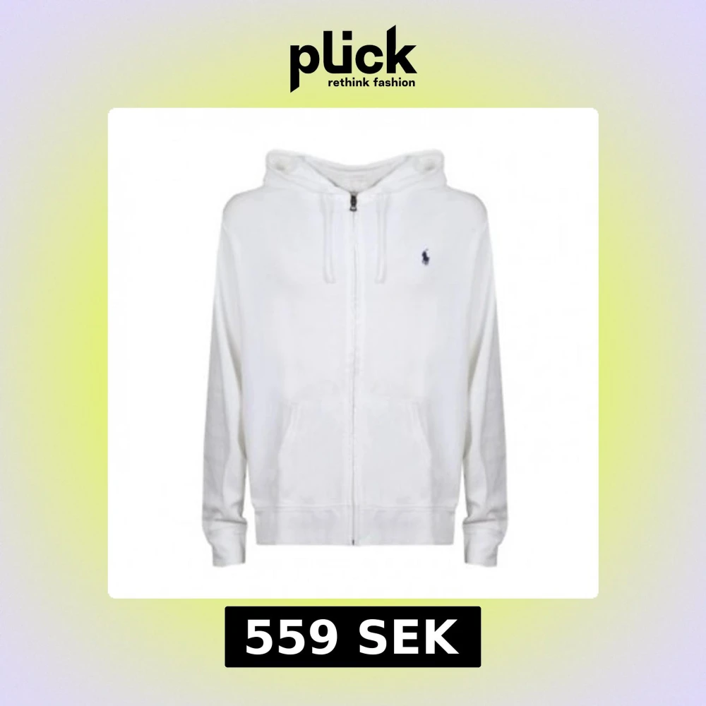 Säljer en stilren vit hoodie från Ralph Lauren med dragkedja och det klassiska logotypbroderiet på bröstet. Hoodien är tunn och är perfekt när du vill ha på dig något tunt under sommar kvällar!