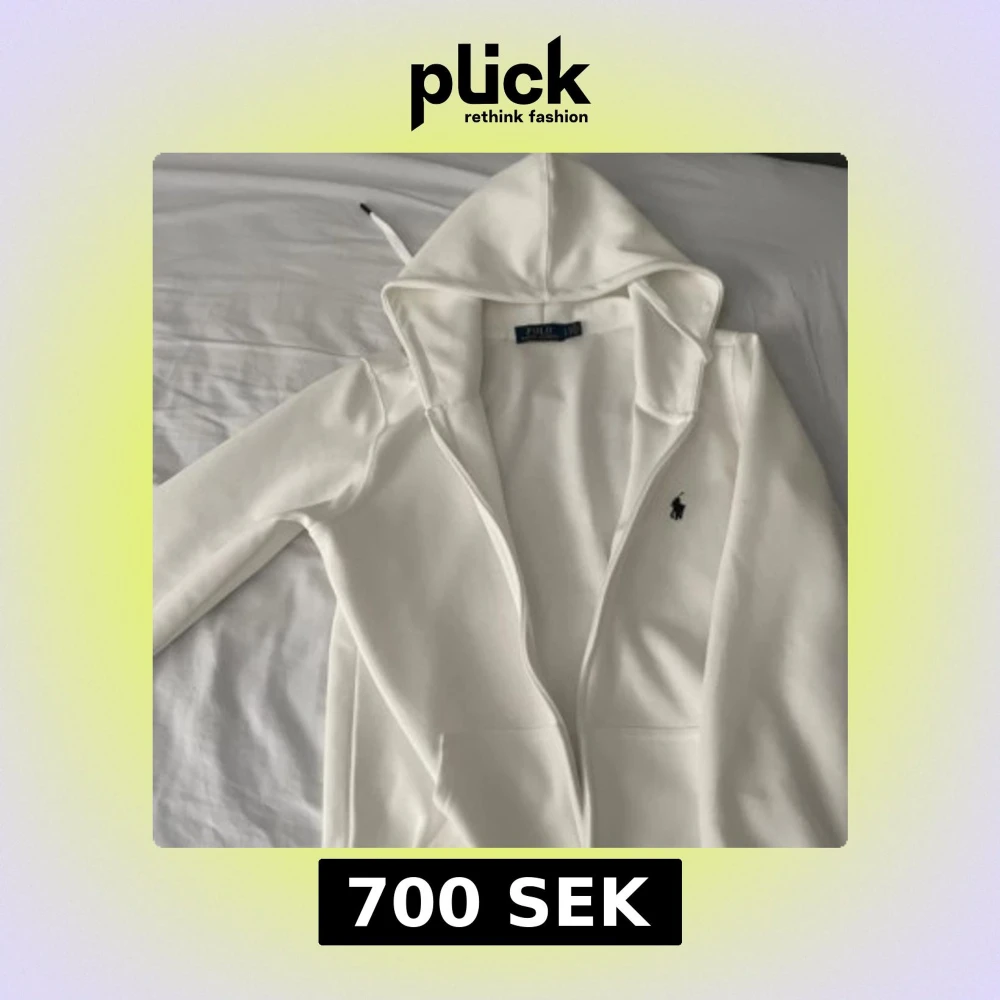 Säljer en stilren vit hoodie från Ralph Lauren med dragkedja och det klassiska broderade logotypen på bröstet. Perfekt för en avslappnad look. Den har en justerbar huva och fickor framtill.