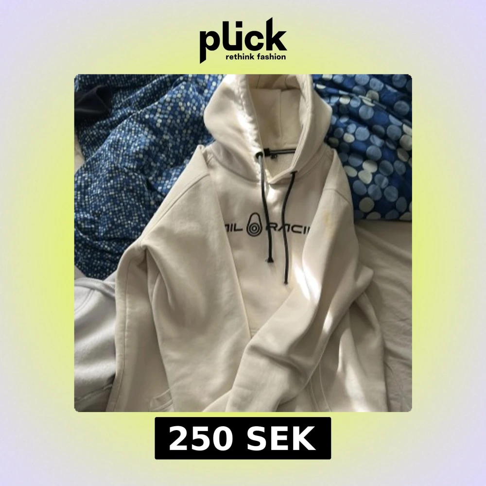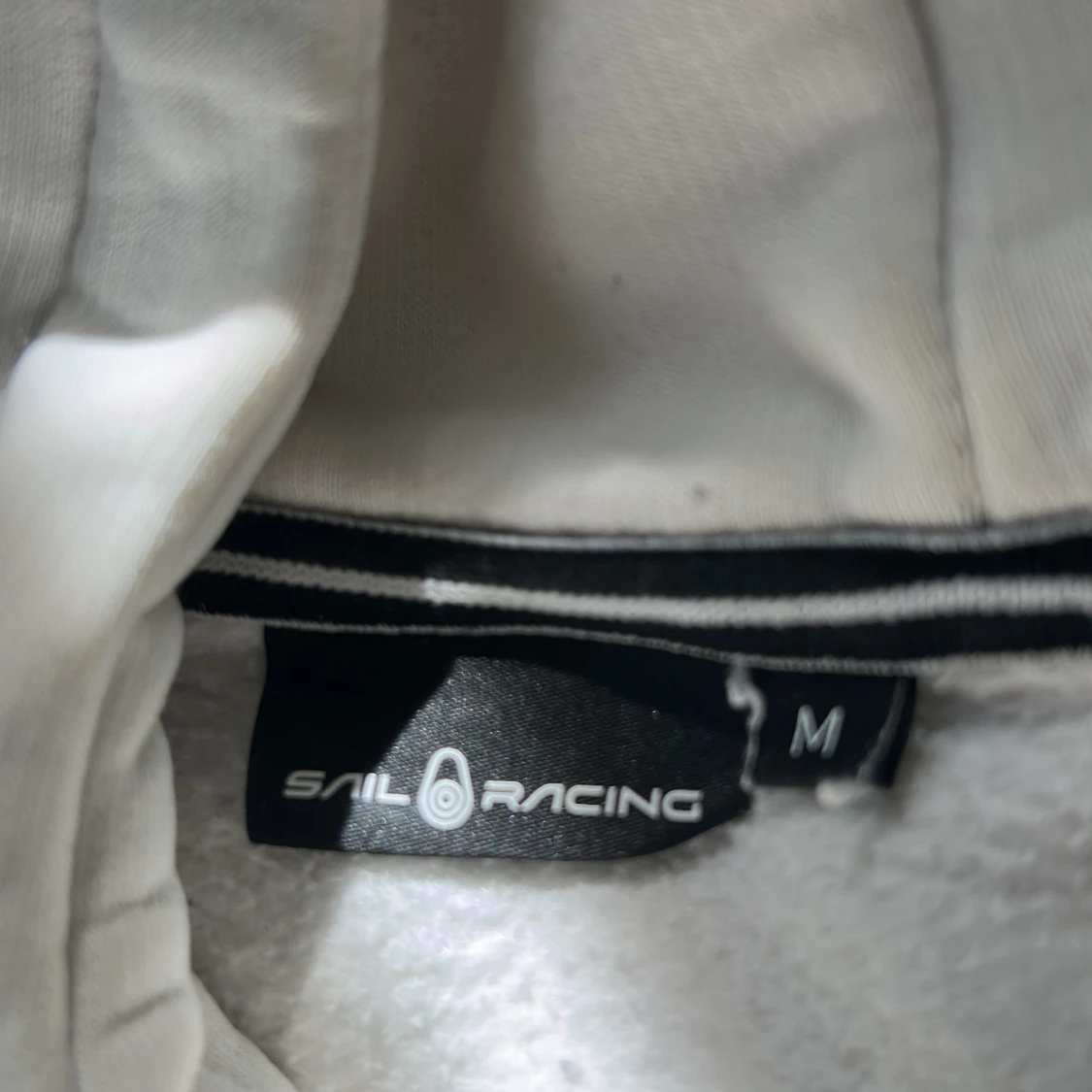 Säljer en vit hoodie från Sail Racing med svart tryck på bröstet och svarta snören i huvan. Tröjan har känguruficka och en avslappnad passform, perfekt för en chill stil. Finns en gul fläck som syns på bilden som förmodligen går bort i tvätten.