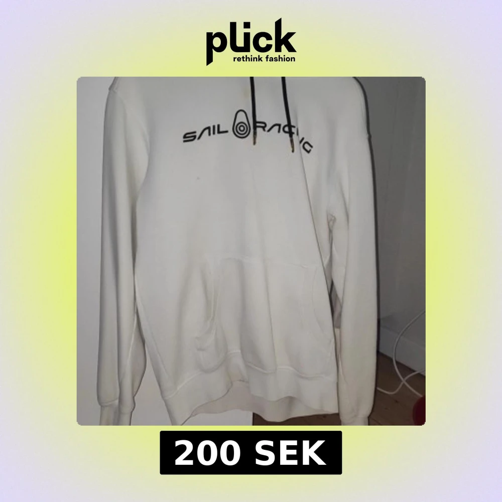 Vit hoodie från Sail Racing med svart logga framtill och tryck på huvan. Klassisk känguruficka, svarta snören och mjuk känsla. Perfekt för dig som gillar stilren och sportig look.