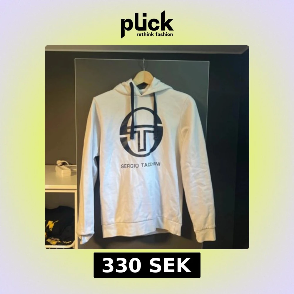 Vit hoodie från Sergio Tacchini med stor svart logga och text på bröstet. Tröjan har huva med svarta snören och långa ärmar. Mjuk insida och klassisk passform, perfekt för en chill och sportig stil.