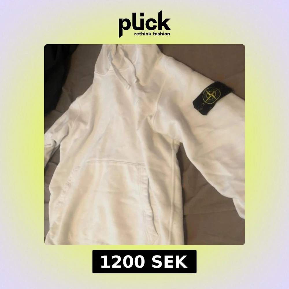 Säljer en stilren vit hoodie från Stone Island med deras ikoniska märke på ärmen. Tröjan har en klassisk design med huva och en stor ficka framtill. Perfekt för en avslappnad look. Pris kan diskuteras vid snabb affär