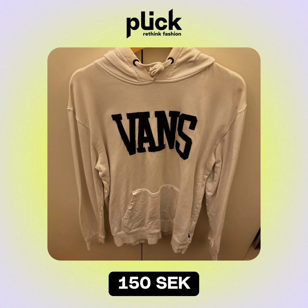 Säljer en snygg vit hoodie från Vans i storlek medium. Den har en stor svart Vans-logga på framsidan och texten 'Off The Wall' på insidan av kragen. Perfekt för en avslappnad stil och passar till alla tillfällen. Den är i bra skick och superbekväm att ha på sig. 🖤