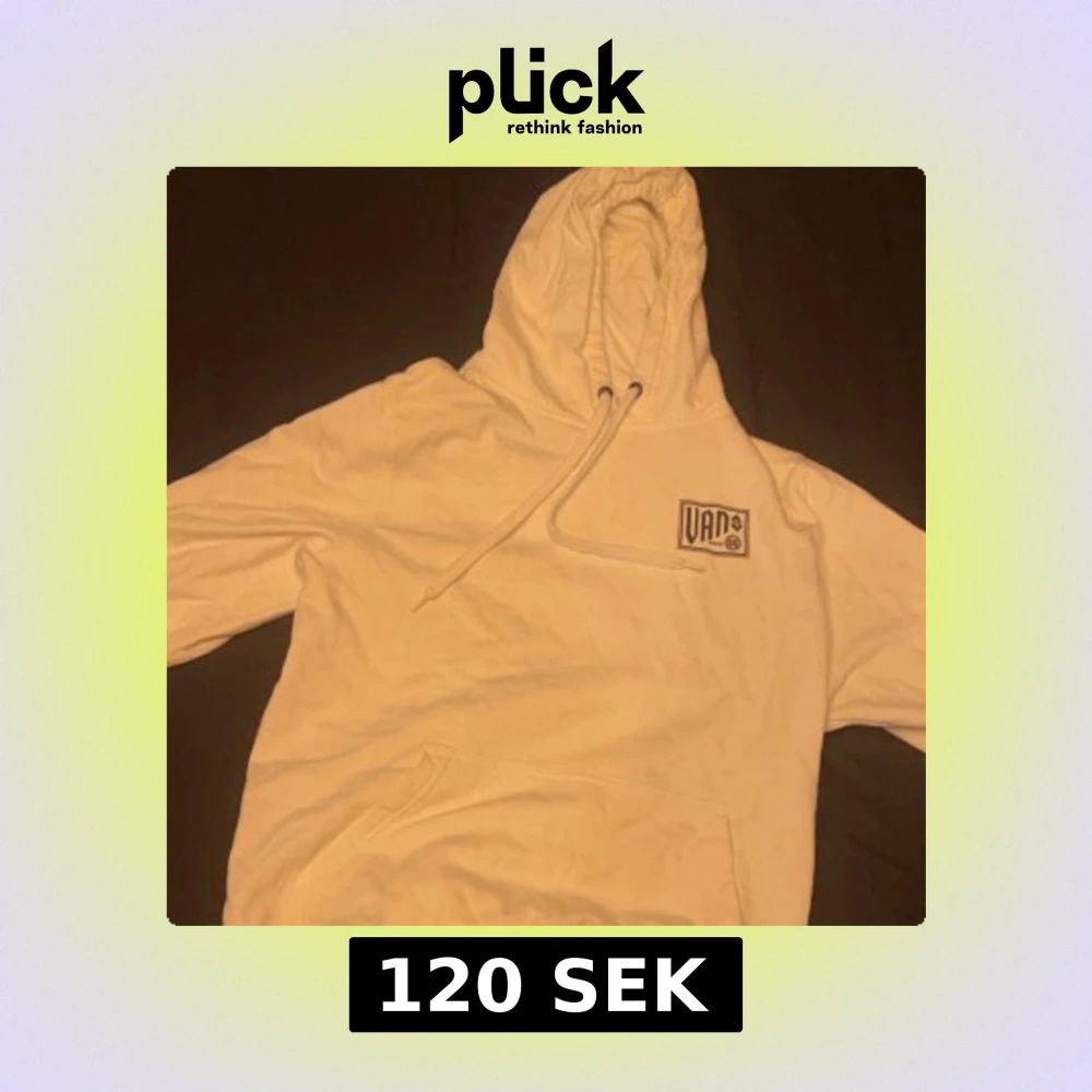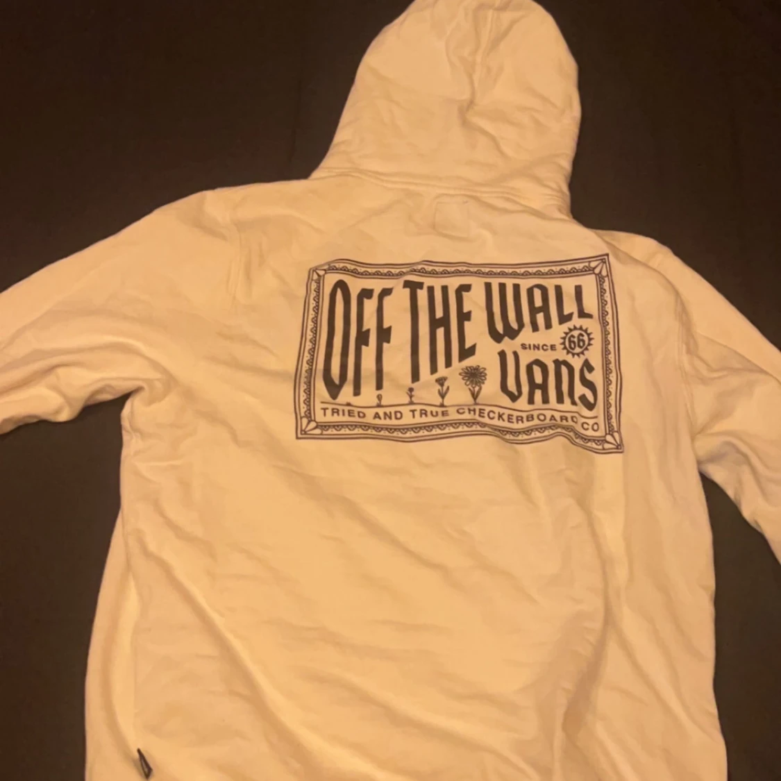Säljer en stilren vit hoodie från Vans med klassisk logga på bröstet och stort tryck på ryggen. Nästan aldrig använd. Nypris 540