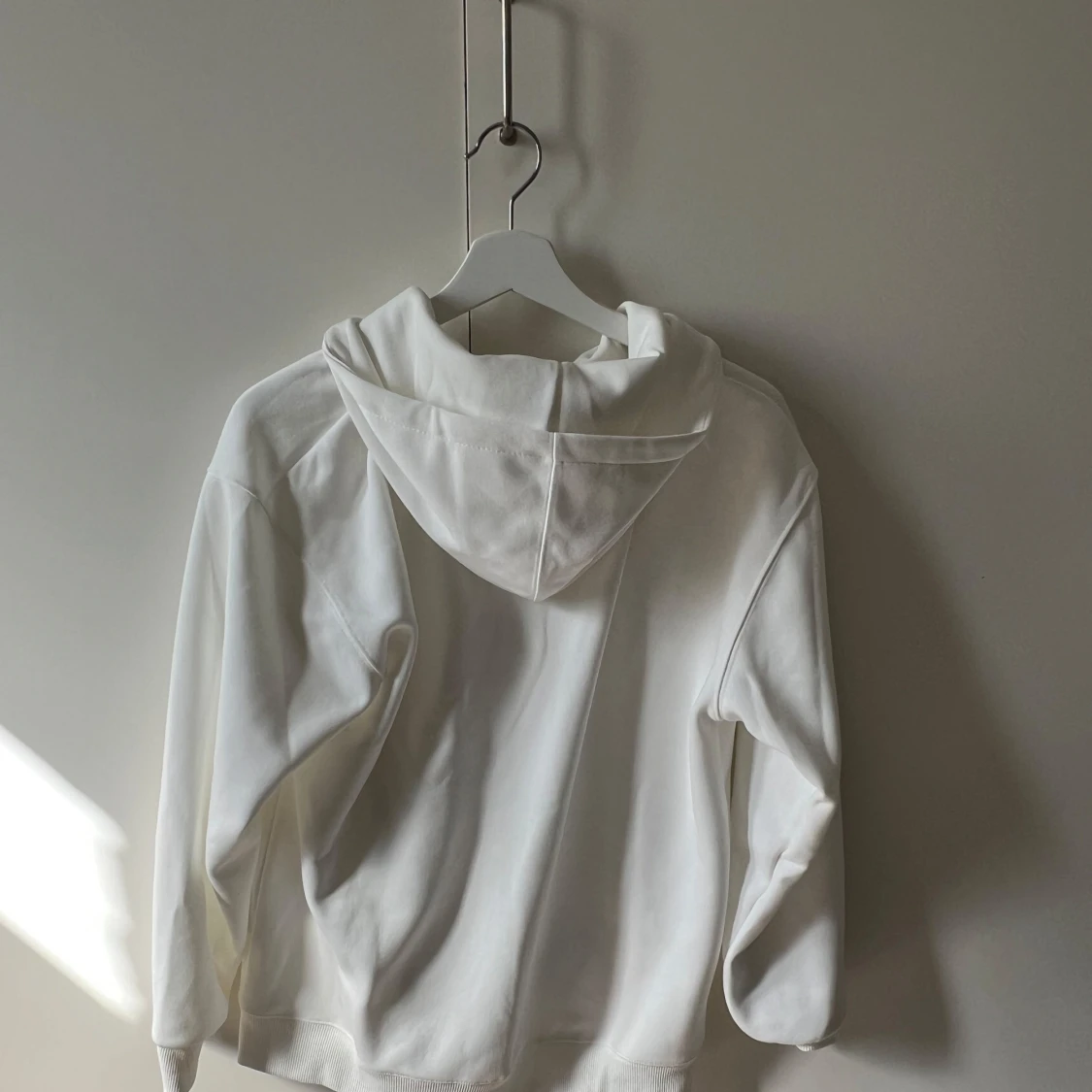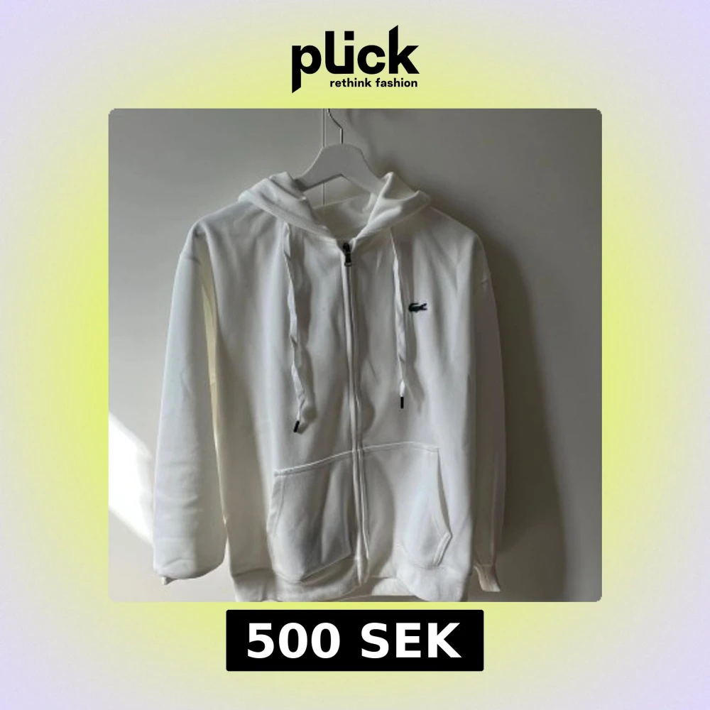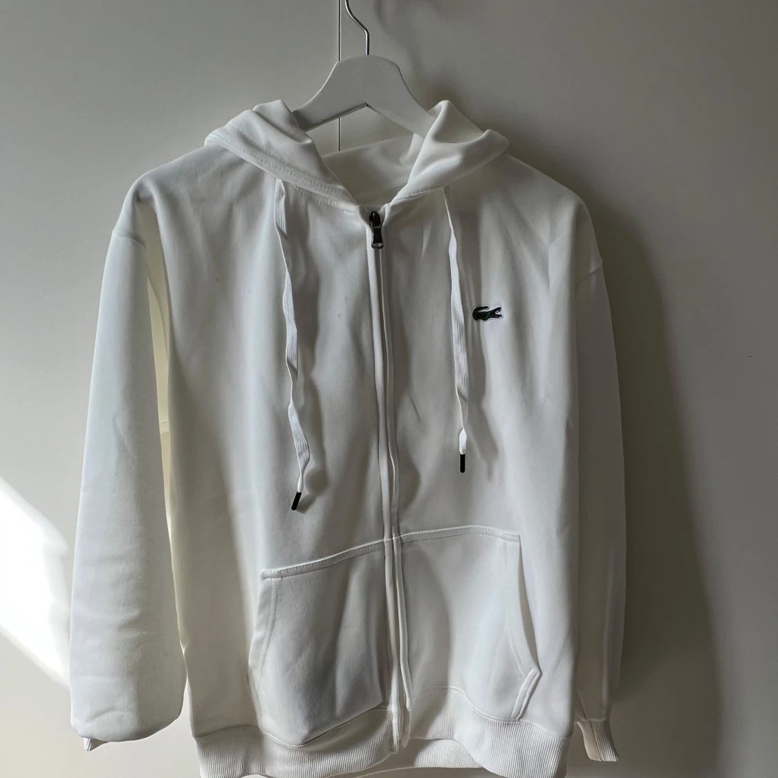 Säljer en klassisk vit hoodie från Lacoste med dragkedja framtill och huva med snören. Tröjan har två stora fickor fram och den ikoniska krokodilloggan på bröstet. Perfekt för en avslappnad och stilren look.