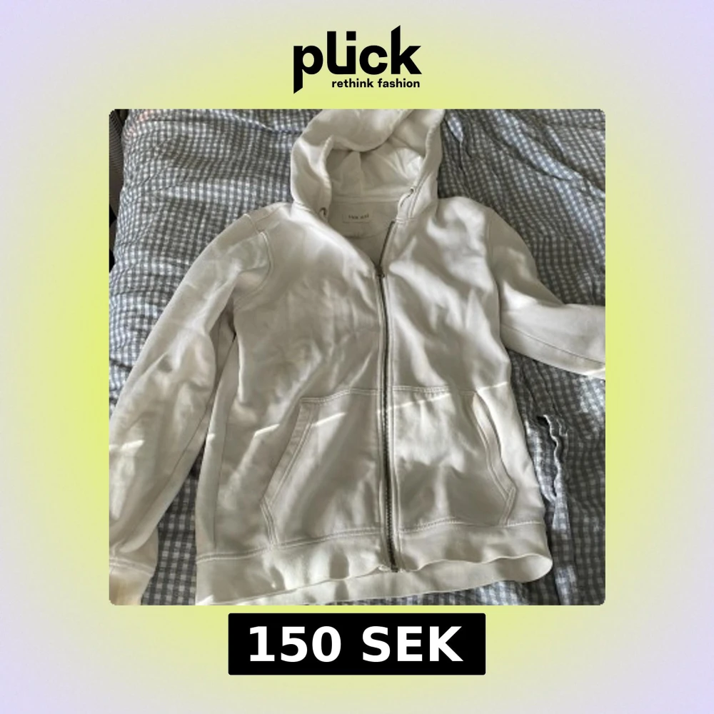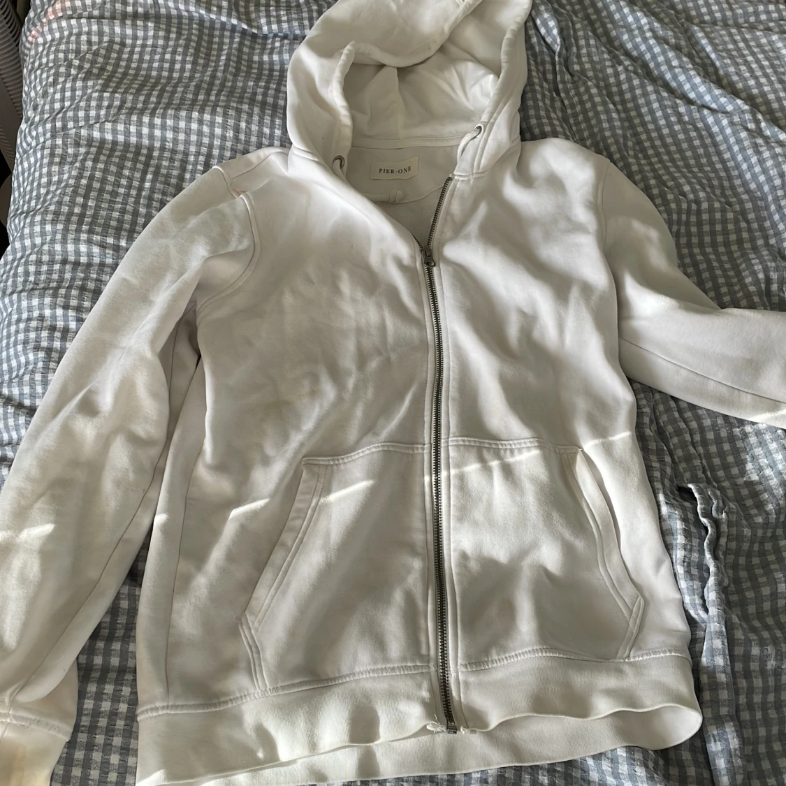 Vit hoodie från Pier One med dragkedja framtill och två fickor. Klassisk modell med huva och långa ärmar. Tillverkad i mjuk bomull, perfekt för chill dagar eller när du vill ha en enkel och clean look. Lite defekter som man kan se på bilderna